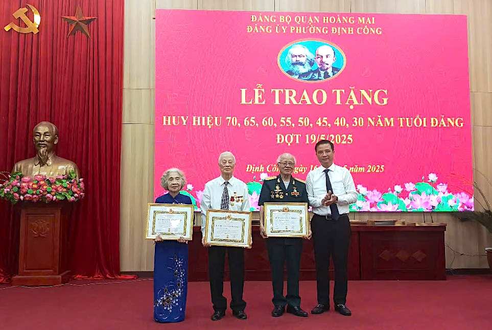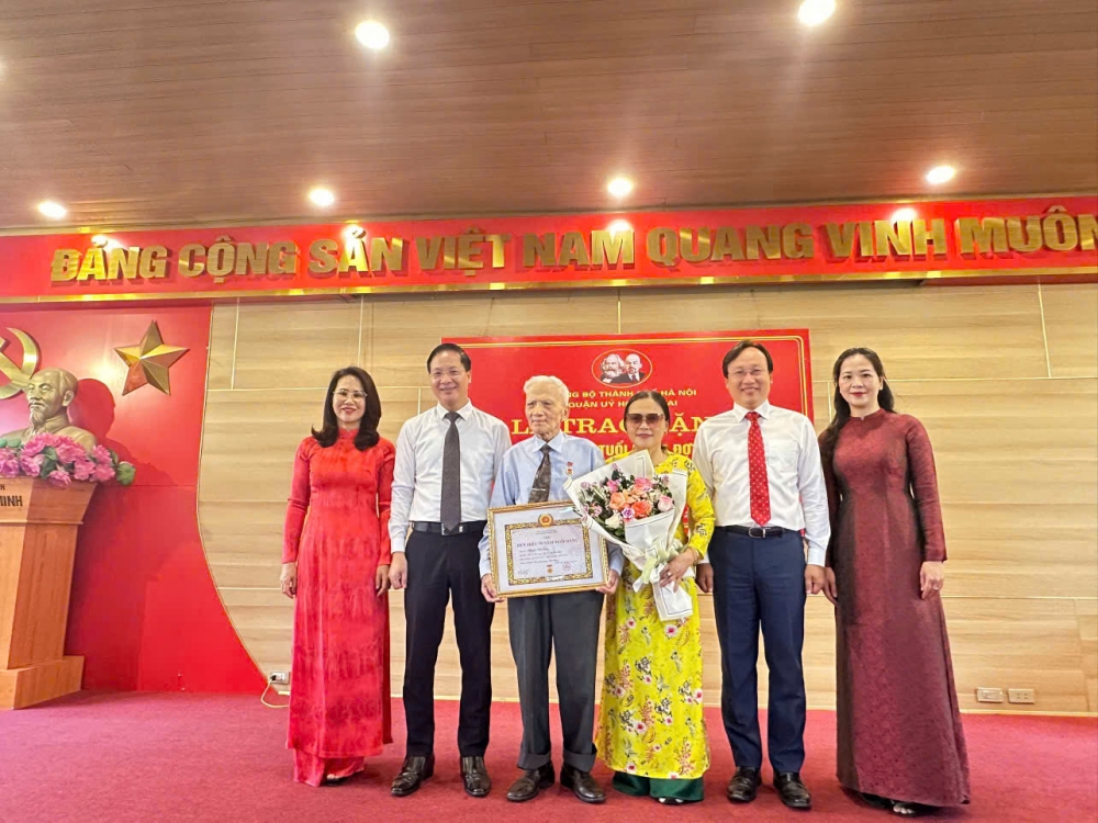 | Bí thư Quận uỷ Hoàng Mai Nguyễn Xuân Linh trao Huy hiệu Đảng cho đảng viên lão thành phường Định Công |