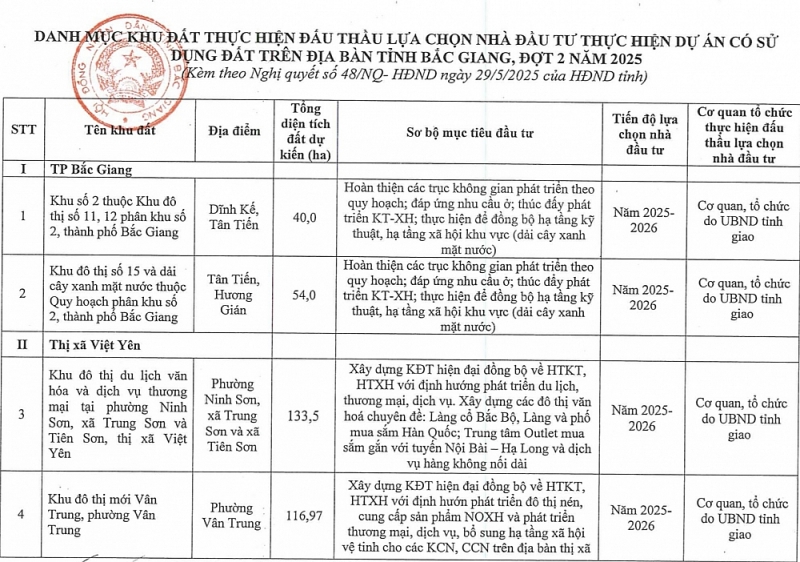 HĐND tỉnh Bắc Giang mới đây đã ban hành Nghị quyết số 48 quyết định danh mục các khu đất thực hiện đấu thầu lựa chọn nhà đầu tư thực hiện dự án đầu tư có sử dụng đất trên địa bàn tỉnh Bắc Giang, đợt 2 năm 2025.