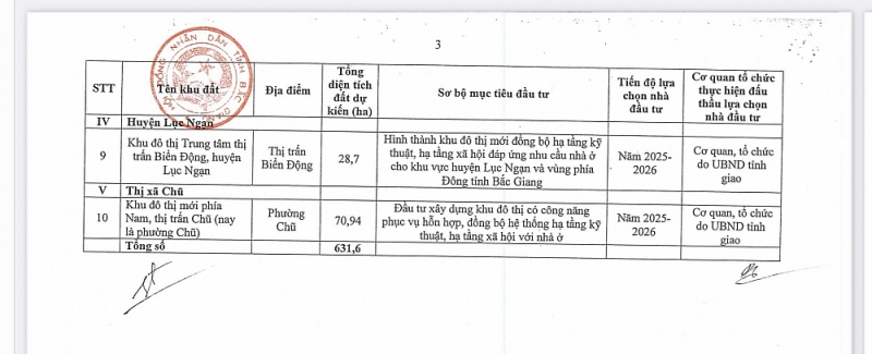 Theo nghị quyết, có 10 khu đất trên địa bàn TP Bắc Giang, thị xã Việt Yên, huyện Yên Thế, huyện Lục Ngạn, thị xã Chũ với tổng diện tích dự kiến hơn 631ha. Tiến độ lựa chọn nhà đầu tư dự kiến năm 2025 - 2026.
