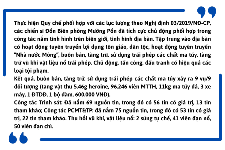 Ngoài việc hỗ trợ giúp dân, các cán bộ chiến sĩ của Đồn Biên phòng Mường Pồn cũng tích cực, chủ động sử dụng các biện pháp công tác biên phòng, nắm chắc tình hình về biên giới, địa bàn nội ngoại biên, tập trung nắm tình hình từ xa; trinh sát, đấu tranh phòng chống ma túy và tội phạm.