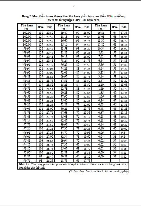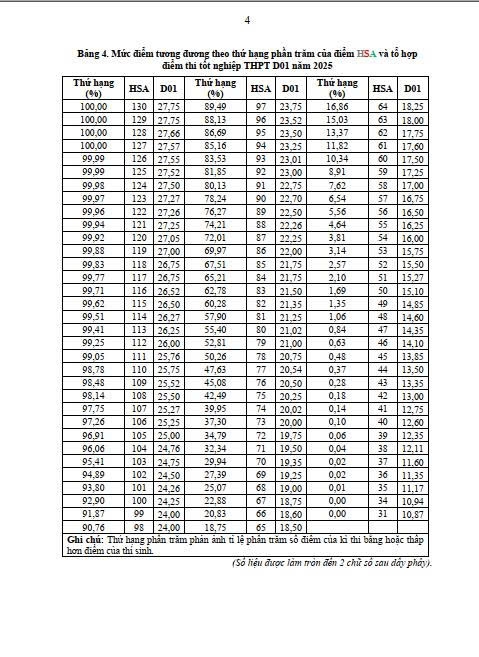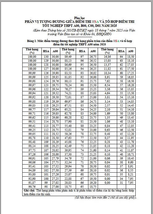 Đại học Quốc gia Hà Nội (ĐHQGHN) vừa chính thức ban hành Thông báo số 205/TB-ĐTSKT về phân vị tương đương giữa điểm thi Đánh giá năng lực học sinh trung học phổ thông (HSA) và tổ hợp điểm thi tốt nghiệp THPT các khối A00, B00, C00, D01 năm 2025.