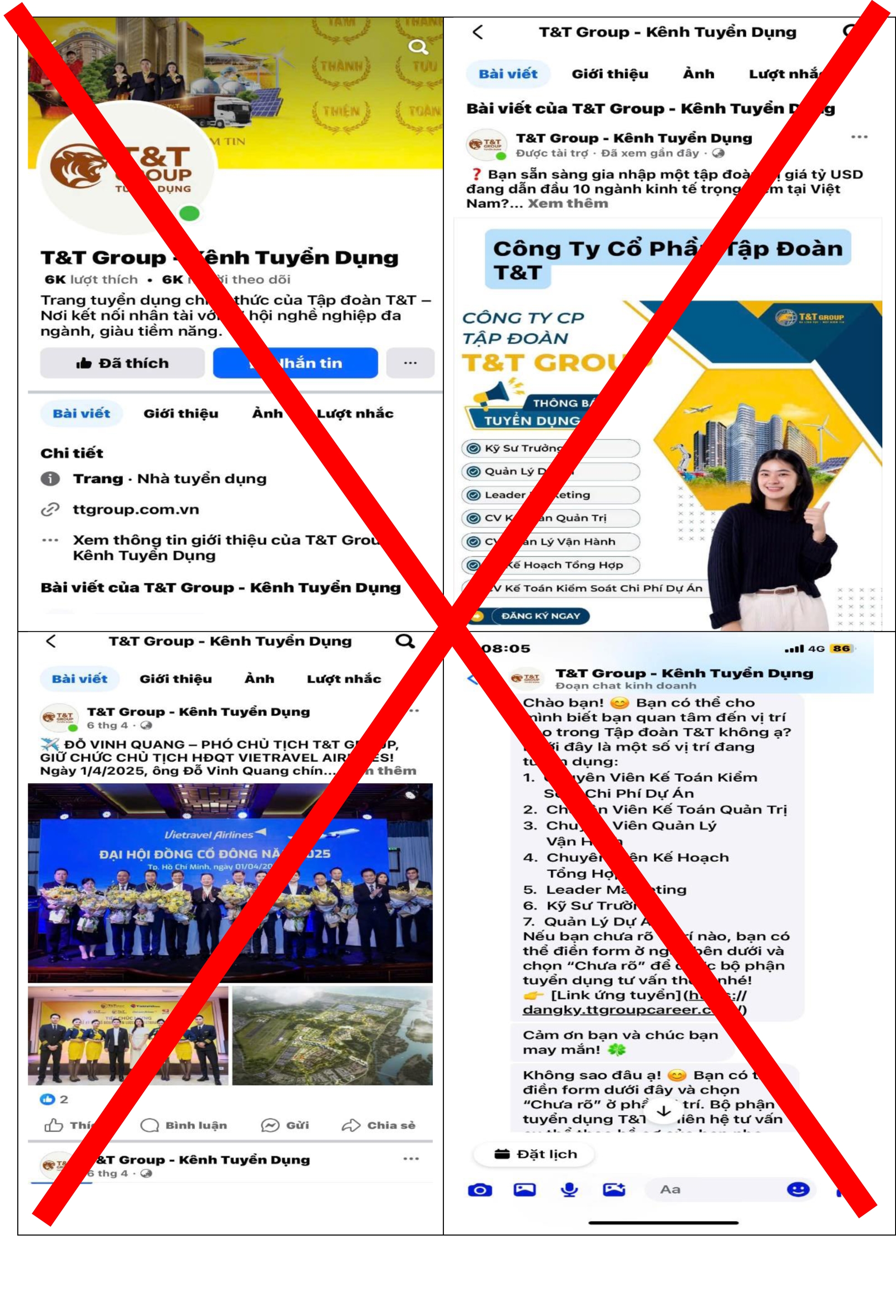 Cụ thể, ngày 6/4/2025, trên nền tảng mạng xã hội Facebook xuất hiện fanpage “T&T group – Kênh tuyển dụng” (Link: https://www.facebook.com/people/TT-Group-K%C3%AAnh-Tuy%E1%BB%83n-D%E1%BB%A5ng/61574914595832) đăng các thông tin giả mạo danh nghĩa Tập đoàn T&T để lôi kéo, dụ dỗ những người có nhu cầu tìm việc làm đăng ký dự tuyển và chuyển tiền để chiếm đoạt.