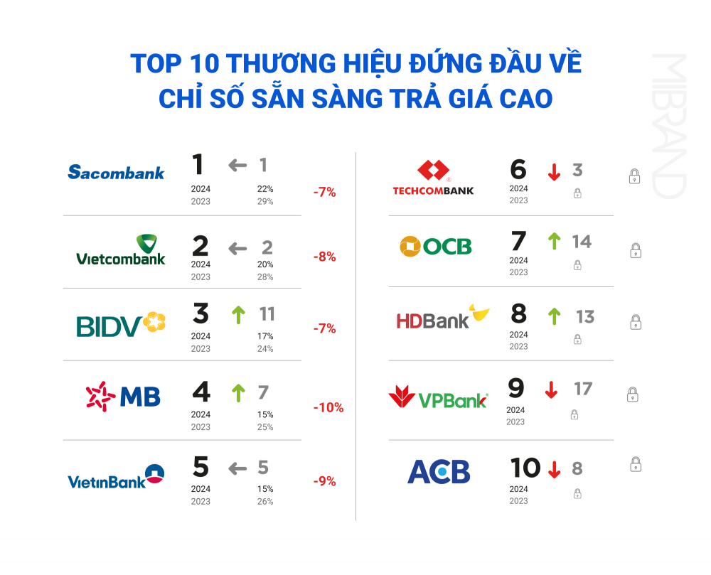 Vượt qua các ngân hàng quốc doanh, Sacombank (22) đã cho thấy sức mạnh của mình trong việc giữ chân khách hàng trung thành, tiếp tục duy trì vị thế đầu tiên trên bảng xếp hạng về Chỉ số sẵn sàng trả giá cao. Điều này đến từ sự cố gắng nâng cao chất lượng dịch vụ để phù hợp với người tiêu dùng, trong bối cảnh sản phẩm/dịch vụ dành cho đại chúng không có quá nhiều chênh lệch giữa các ngân hàng.