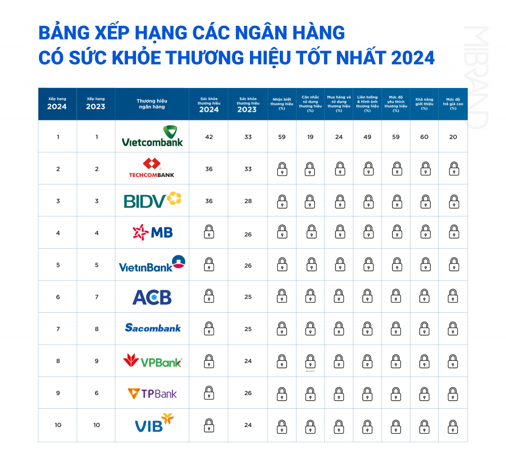 Báo cáo sức khỏe thương hiệu Ngân hàng Việt Nam 2024 được Mibrand xây dựng dựa trên bộ công cụ độc quyền Brand Beat Score.