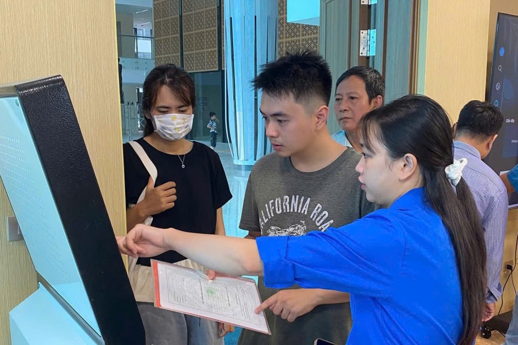 | Thanh niên tình nguyện hỗ trợ người dân tra cứu thủ tục hành chính, tạo thuận lợi trong giải quyết hồ sơ trực tuyến |