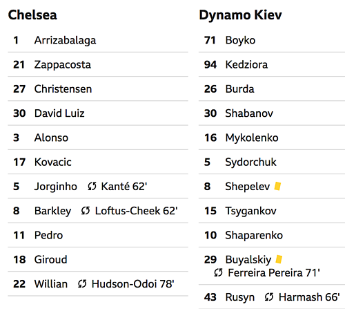 HLV Sarri có sáu thay đổi so với trận đấu gần nhất khi cất các trụ cột như Eden Hazard, N'Golo Kante và Gonzalo Higuain trên ghế dự bị. Tuy nhiên, các cầu thủ còn lại vẫn đủ sức giành chiến thắng nhẹ nhàng trước đội bóng từ Ukraine. Trung phong Giroud tiếp tục chứng tỏ duyên ở Europa League khi ghi dấu giày vào bàn thắng ở sáu trận liên tiếp. Trong năm trận trước, tiền đạo người Pháp nổ súng tới sáu lần.