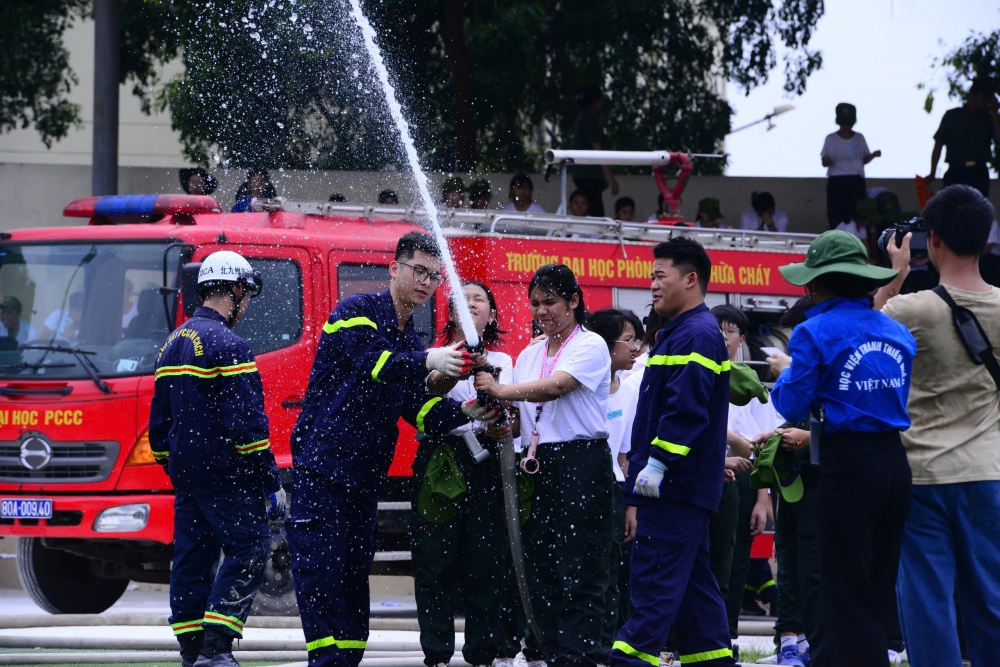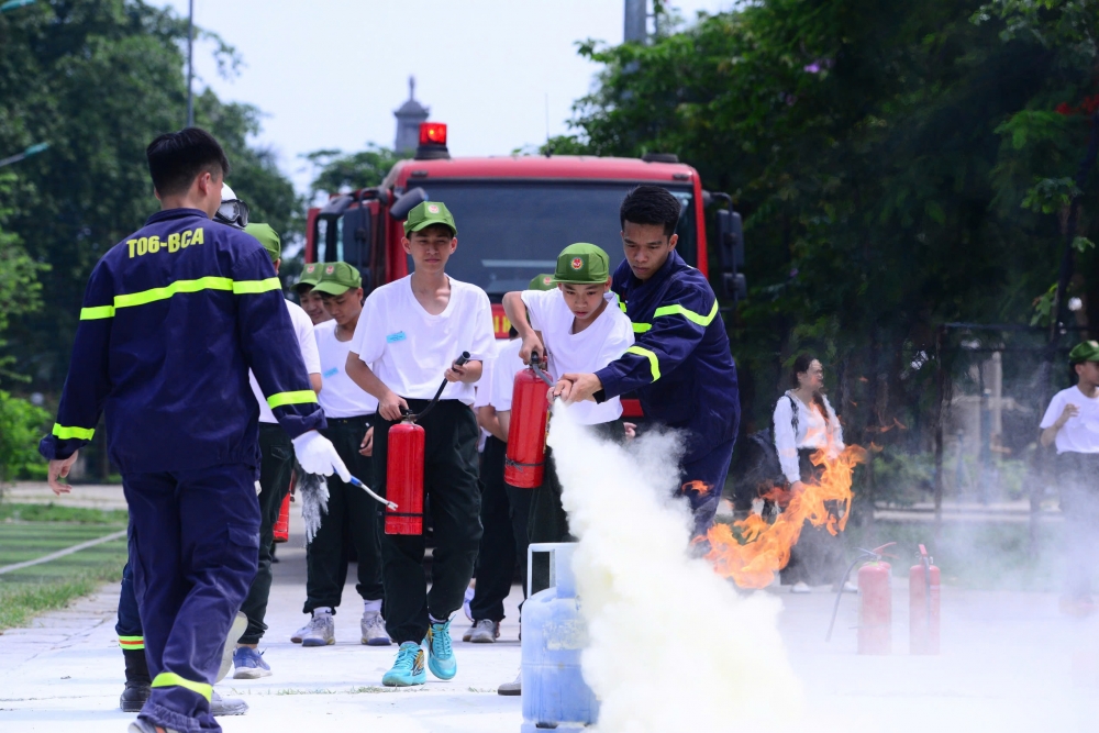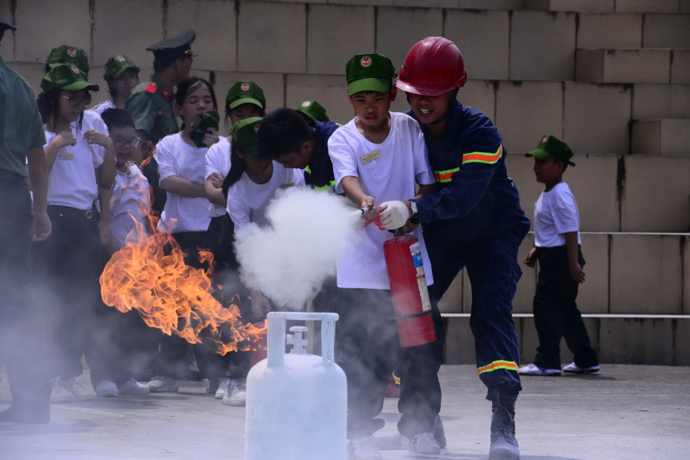 Trong chương trình “Học làm chiến sĩ Công an” hè 2025, các em nhỏ được trải nghiệm kỹ năng phòng cháy chữa cháy như vượt “biển khói”, sử dụng bình cứu hỏa, vòi phun nước... giúp nâng cao ý thức, sẵn sàng ứng phó với sự cố hỏa hoạn.
