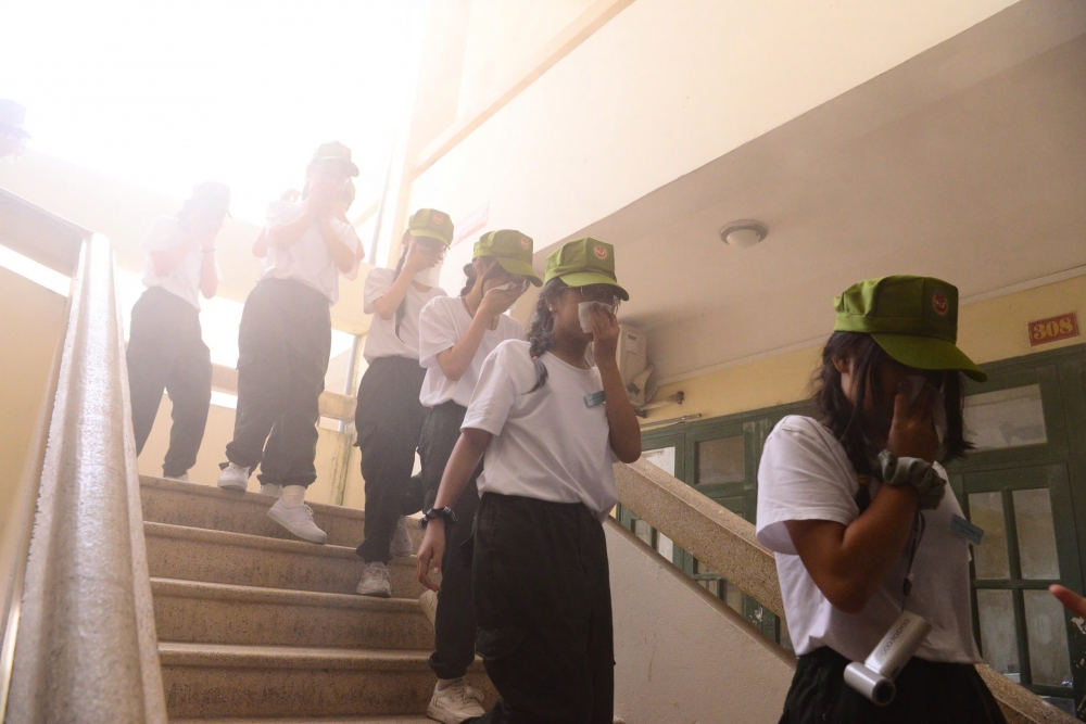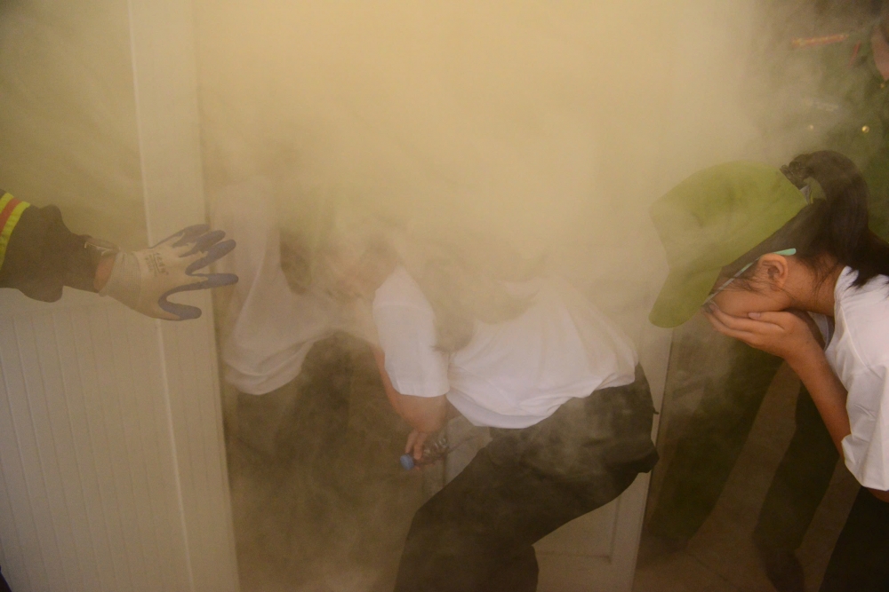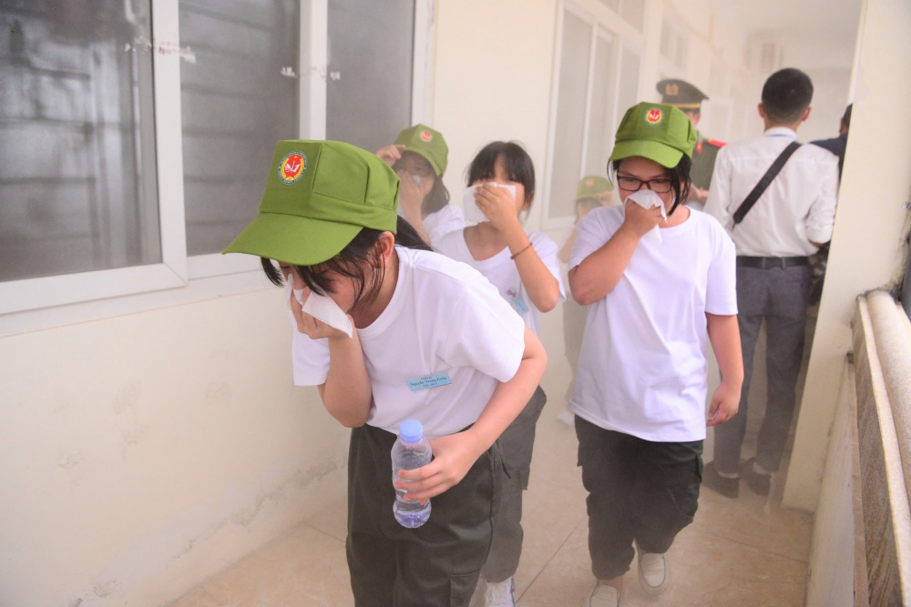 Tại đây, các em được hướng dẫn cách di chuyển thấp người qua làn khói dày đặc nhằm bảo vệ an toàn đường thở và quan sát lối thoát hiểm.