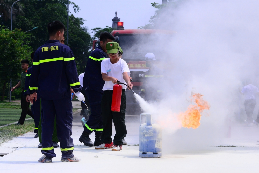 Mỗi em nhỏ được cán bộ hướng dẫn chi tiết cách rút chốt, bóp cò và hướng vòi vào đám cháy giả định. Chiến sĩ nhí tự tay cầm bình chữa cháy và dập ngọn lửa mô phỏng trong sân tập - bước đầu làm quen với kỹ năng xử lý đám cháy nhỏ.