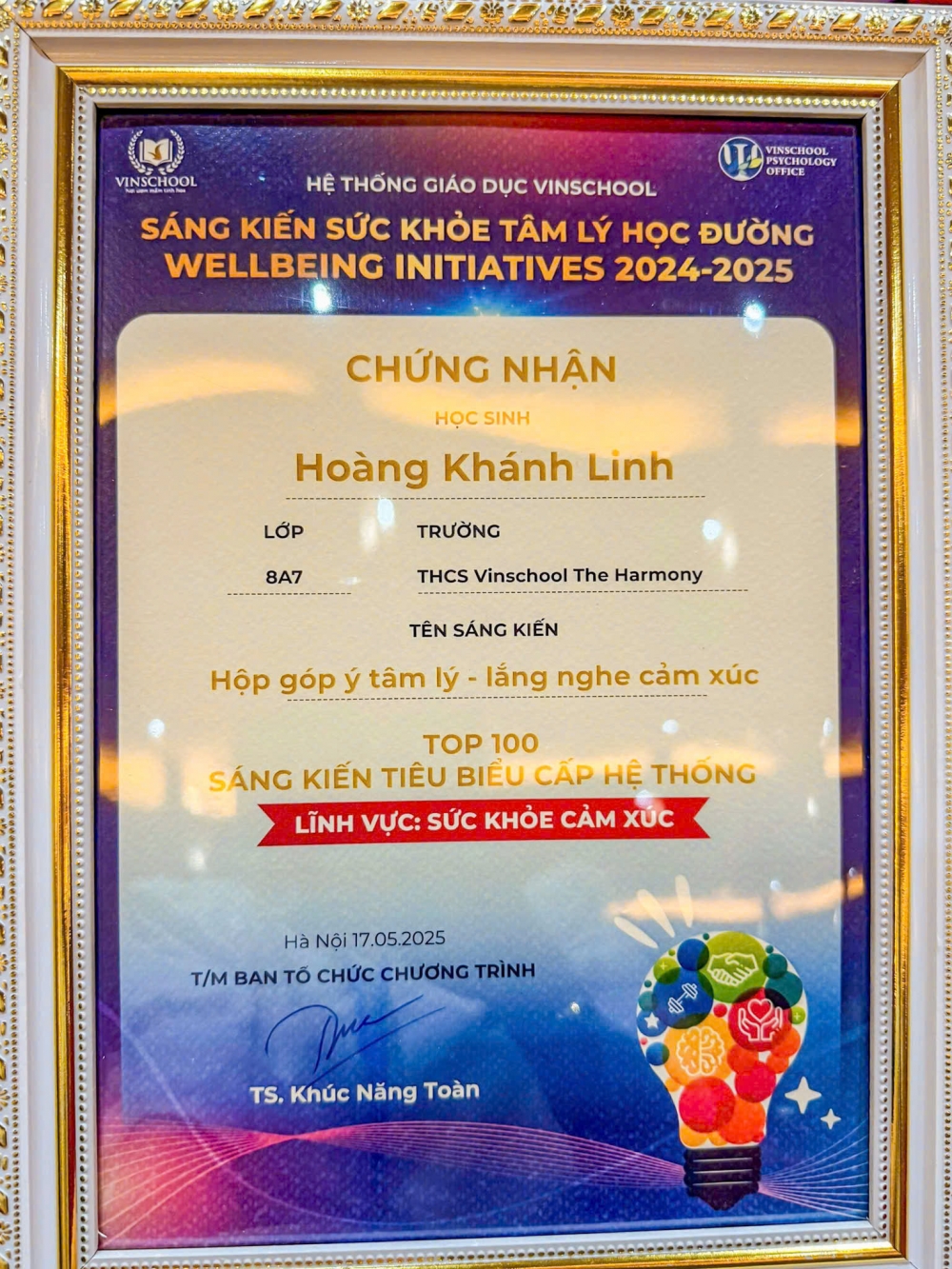 Được chọn vào Top 100 sáng kiến xuất sắc nhất toàn hệ thống và vinh danh là Đại sứ Wellbeing, với Khánh Linh không phải là đích đến. Cô học trò xem xem đây là lời nhắc nhở để tiếp tục lắng nghe, thấu hiểu và lan tỏa sự tử tế mỗi ngày.