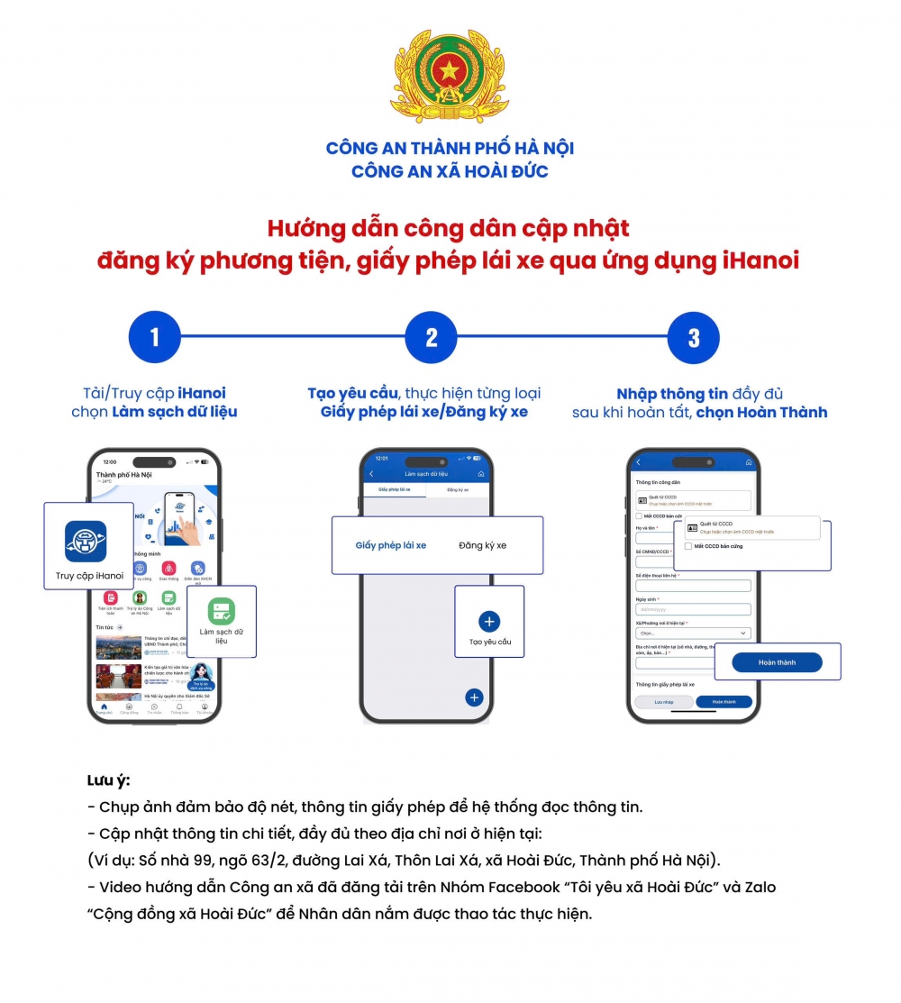 Công an xã Hoài Đức đã chủ động xây dựng phương án chi tiết, huy động tối đa quân số, chia thành các tổ công tác xuống trực tiếp từng tổ dân phố, khu dân cư, các tòa nhà cao tầng để hướng dẫn tập trung, hỗ trợ người dân rà soát thông tin, đối chiếu dữ liệu phương tiện và cập nhật giấy phép lái xe; bảo đảm phương châm “không để lọt, không để sót dữ liệu”.