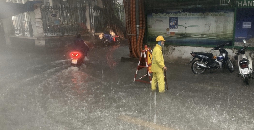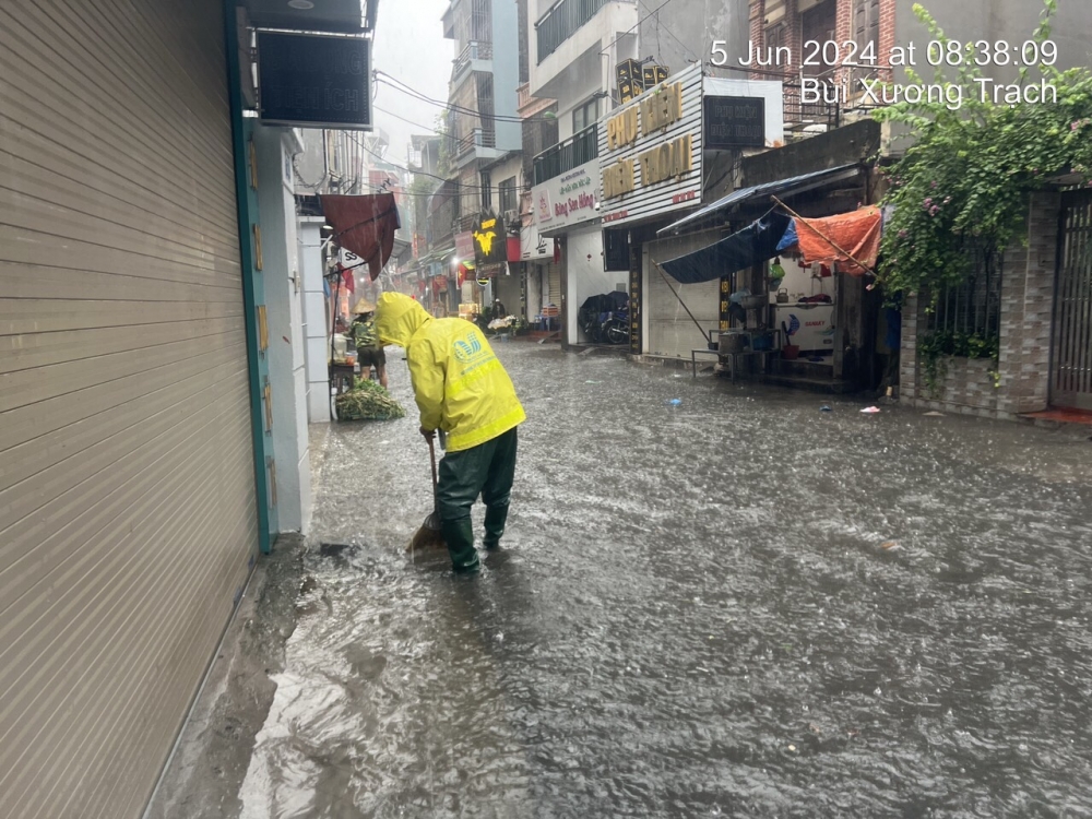 | Các công nhân Xí nghiệp 6 ngâm mình dưới mưa ứng trực tại tuyến phố Quan Nhân |