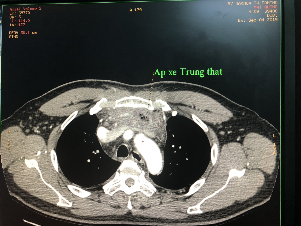 Bệnh nhân Mai Qương sinh năm 1960, Sóc Trăng. 1 tuần trước nhập viện bệnh nhân sưng đau vùng cổ 2 bên, lan xuống ngực nhập viện điều trị tại bệnh viện tỉnh 5 ngày, sau đó chuyển đến Bệnh viện đa khoa Trung ương Cần Thơ với chẩn đoán áp xe cổ - áp xe trung thất.