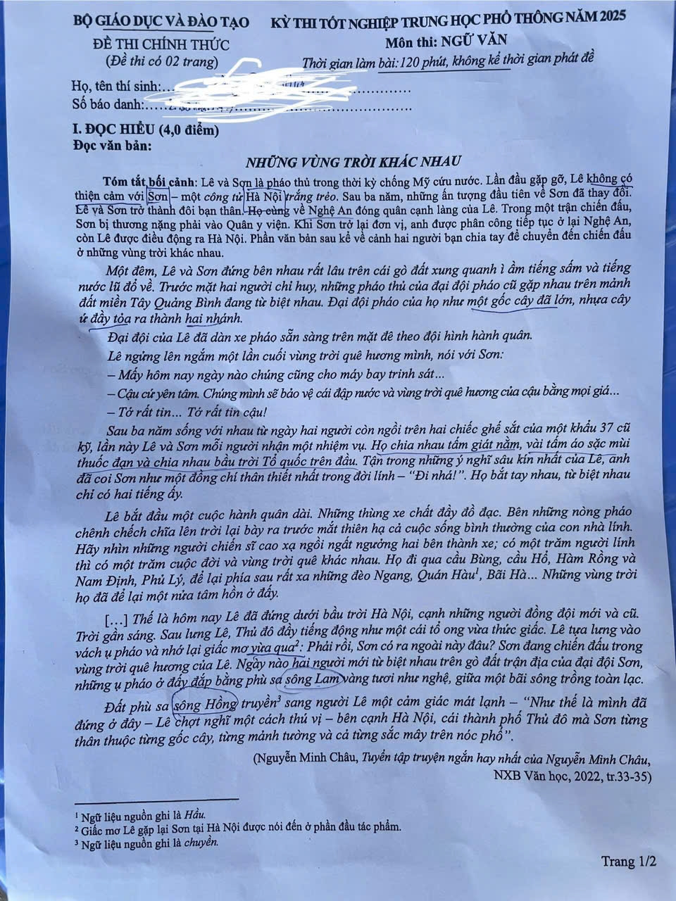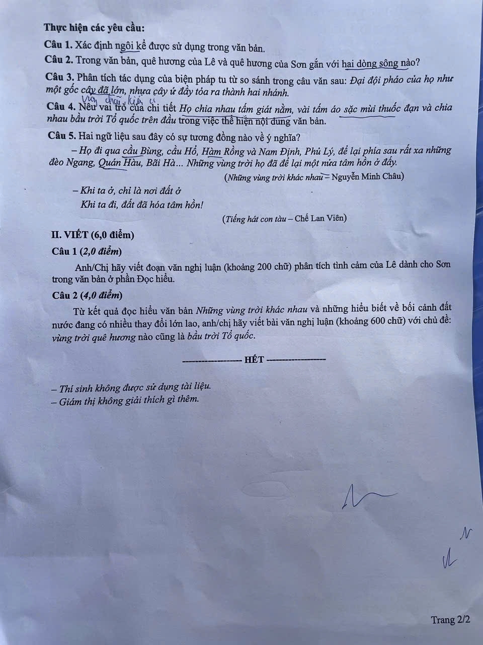 Theo bạn Nguyễn Hà Trang (học sinh trường THPT Việt Đức - Hoàn Kiếm): “Em thấy đề năm nay được xây dựng theo cấu trúc mới khá hay, tạo điều kiện cho thí sinh thoải mái thể hiện quan điểm cá nhân. Đặc biệt, câu nghị luận xã hội với chủ đề “Vùng trời quê hương cũng là bầu trời Tổ quốc” rất ý nghĩa và mang tính thời sự. Chủ đề này không chỉ khơi gợi tình yêu quê hương, đất nước mà còn liên hệ sâu sắc đến tinh thần đoàn kết dân tộc trong bối cảnh hiện nay.