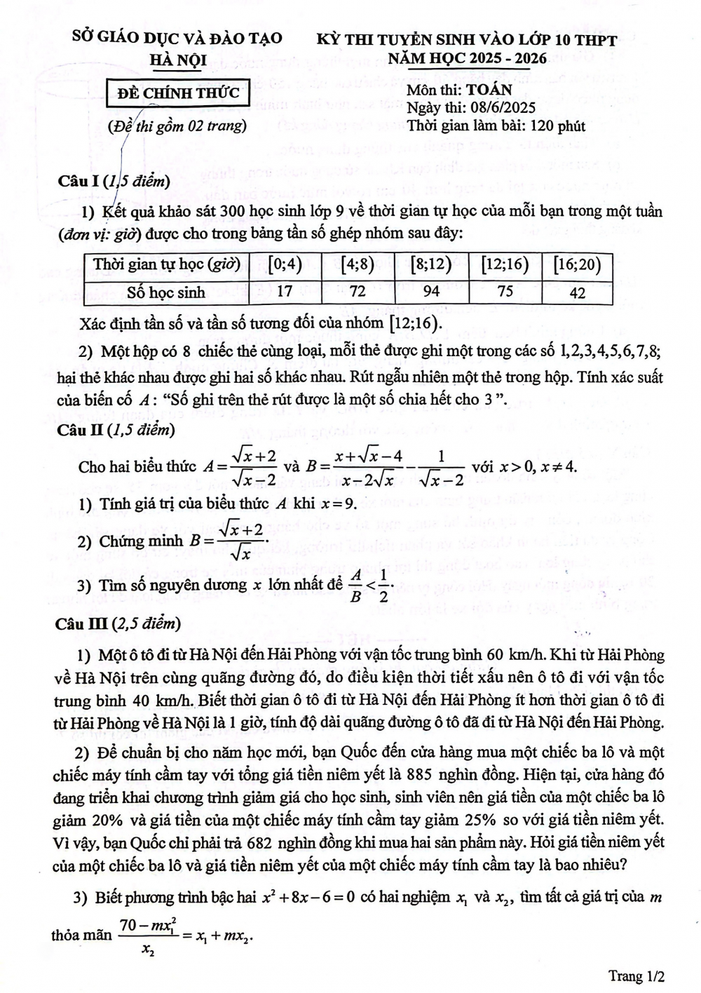 | Đề thi môn Toán vào lớp 10 ở Hà Nội |