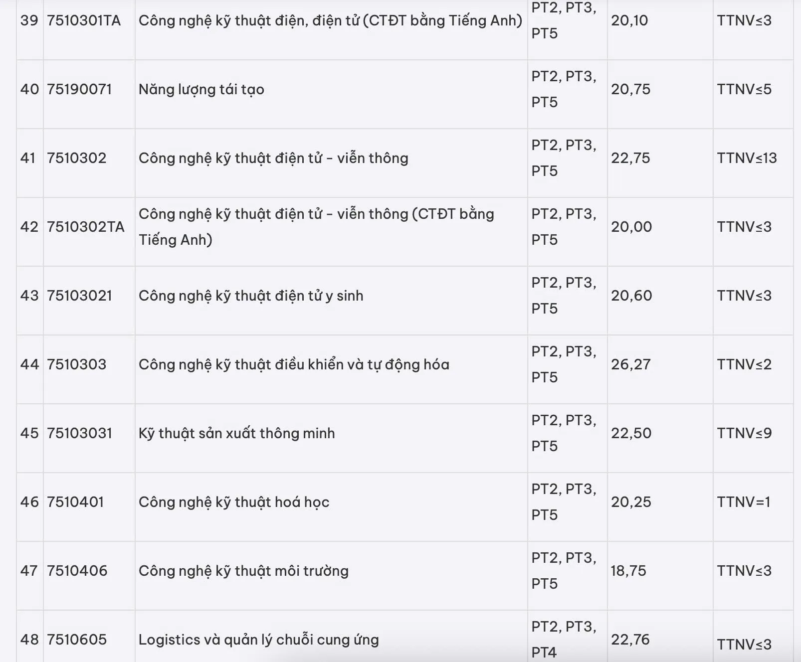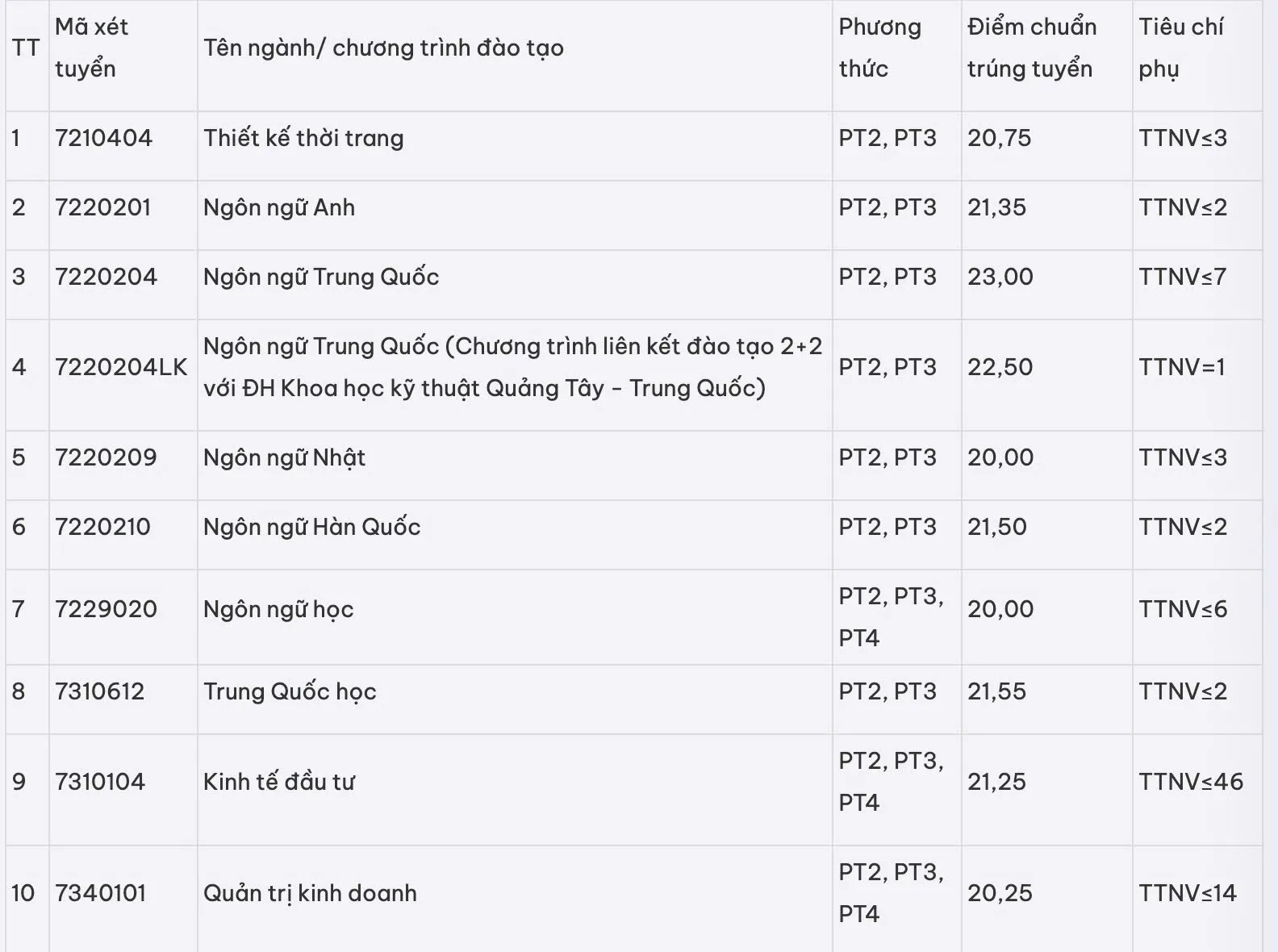 Mức này áp dụng với các tổ hợp A00 (Toán, Lý, Hóa), A01 (Toán, Lý, Anh), D01 (Toán, Văn, Anh), D03 (Toán, Lý, Sử), D04 (Toán, Lý, Địa), D06 (Toán, Hóa, Địa), DD2 (Toán, Văn, Tiếng Hàn), D07 (Toán, Hóa, Anh), D09 (Toán, Anh, Sử), D10 (Toán, Địa, Anh), D14 (Văn, Sử, Anh), D15 (Văn, Địa, Anh).