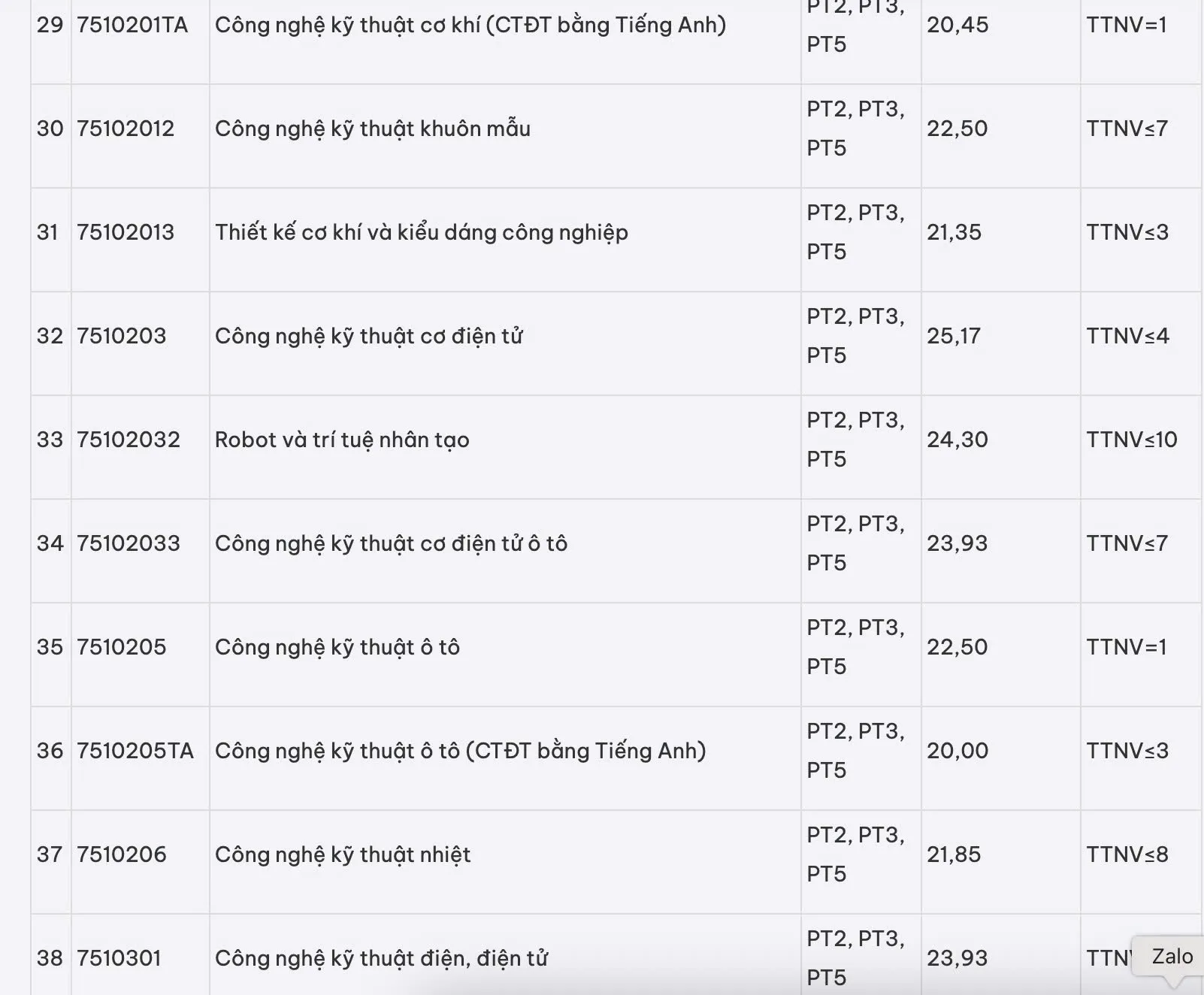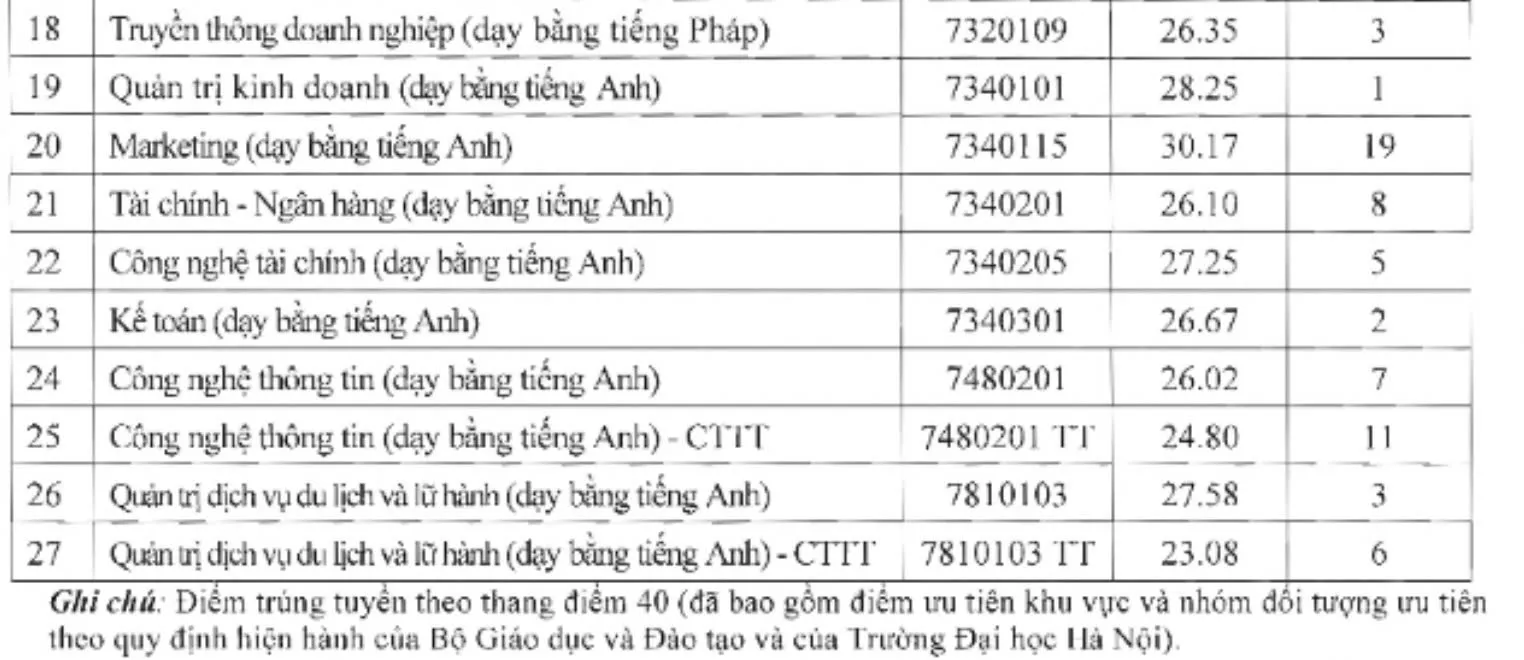 Một số ngành dưới 20 như Công nghệ dệt, may và Du lịch chương trình đào tạo bằng tiếng Anh (18), Quản trị dịch vụ du lịch và lữ hành chương trình đào tạo bằng tiếng Anh (18,1), Quản trị khách sạn chương trình đào tạo bằng tiếng Anh (18,25).