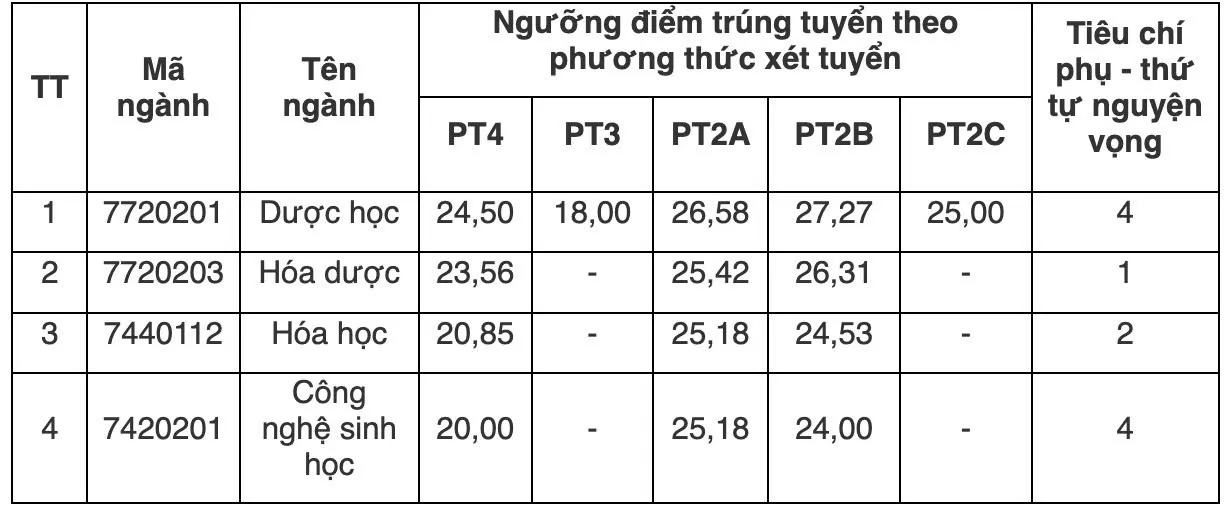 Cụ thể, ngành Dược học có điểm chuẩn xét theo điểm thi tốt nghiệp THPT là 24,5 điểm, giảm hơn 1 điểm so với năm ngoái. Ngành Hóa dược giảm gần 2 điểm. Ngành Hóa học giảm gần 4 điểm. Mức giảm mạnh nhất là ngành Công nghệ sinh học với 20 điểm, giảm 4,26 điểm so với năm 2024.