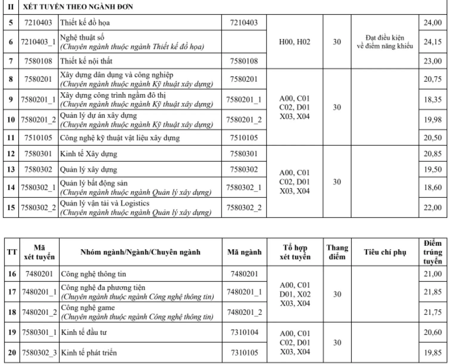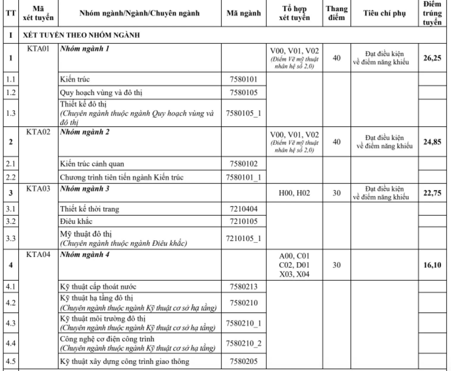 Ở thang 40, trường Đại học Kiến trúc Hà Nội nhân đôi môn năng khiếu (Vẽ mỹ thuật). Nhóm ngành 1 gồm Kiến trúc; Quy hoạch vùng và đô thị; Thiết kế đô thị (chuyên ngành thuộc ngành Quy hoạch vùng và đô thị) với 26,25 điểm.