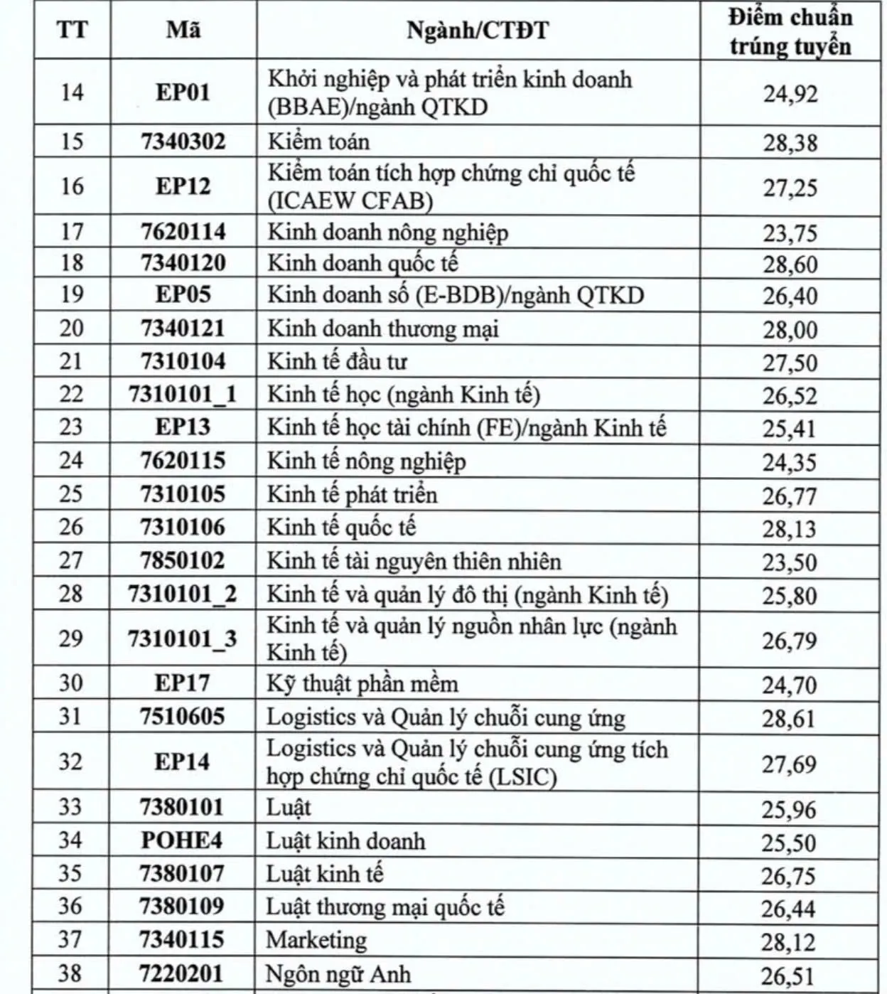 Năm 2025, Đại học Kinh tế Quốc dân (NEU) lấy điểm chuẩn từ 23 đến 28,83, ngành Thương mại điện tử lấy cao nhất.