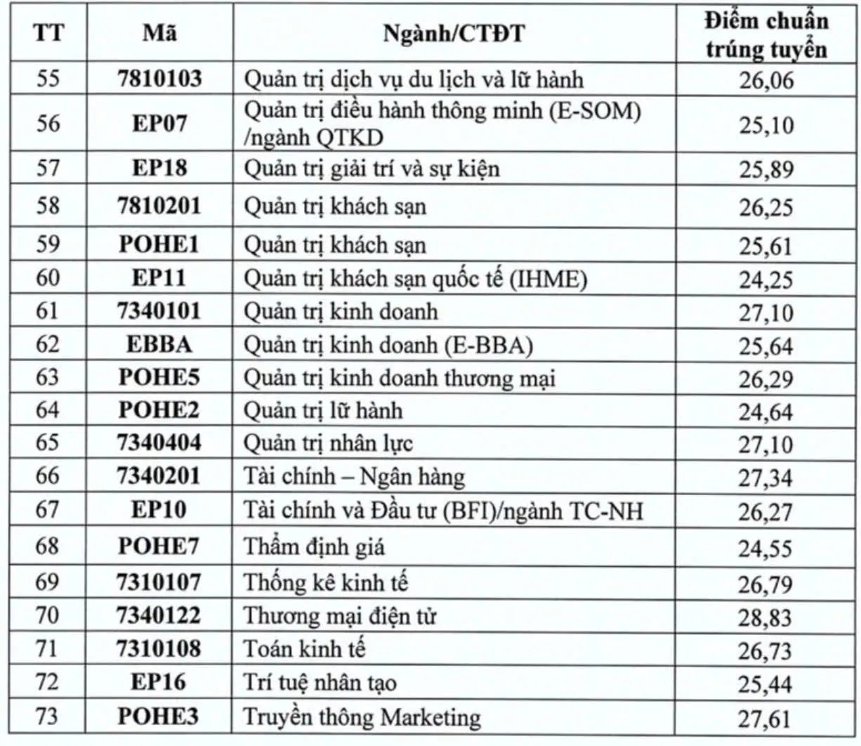 Tiếp đến là 6 chương trình có điểm trúng tuyển trên 27, gồm: chương trình định hướng nghề nghiệp logistics và quản lý chuỗi cung ứng, chương trình tiêu chuẩn kinh tế đối ngoại, chương trình chất lượng cao kinh tế đối ngoại, chương trình chất lượng cao kinh doanh quốc tế, chương trình marketing số, chương trình tiên tiến tài chính - ngân hàng.