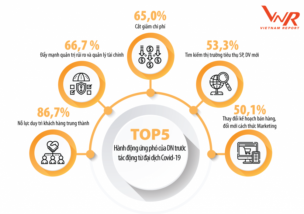 Có 86,7% doanh nghiệp tham gia khảo sát của Vietnam Report cho biết họ đang nỗ lực duy trì khách hàng trung thành, song song với đó, 66,7% doanh nghiệp đẩy mạnh công tác quản trị rủi ro và quản lý tài chính; 65,0% doanh nghiệp thực hiện các biện pháp nhằm cắt giảm chi phí; 53,3% doanh nghiệp tìm kiếm thị trường tiêu thụ sản phẩm và dịch vụ mới; 50,1% doanh nghiệp thay đổi kế hoạch bán hàng, đổi mới cách thức marketing.