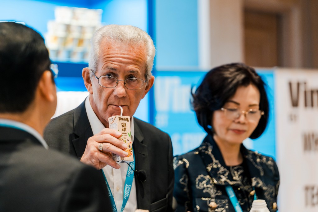 | Ông Richard Hall - Chủ tịch Hội nghị sữa toàn cầu bày tỏ sự ấn tượng khi nếm thử sản phẩm Sữa chua ăn thực vật Vinamilk với 2 vị: Vị truyền thống từ 9 loại hạt và Yến mạch kết hợp chanh dây, xoài |