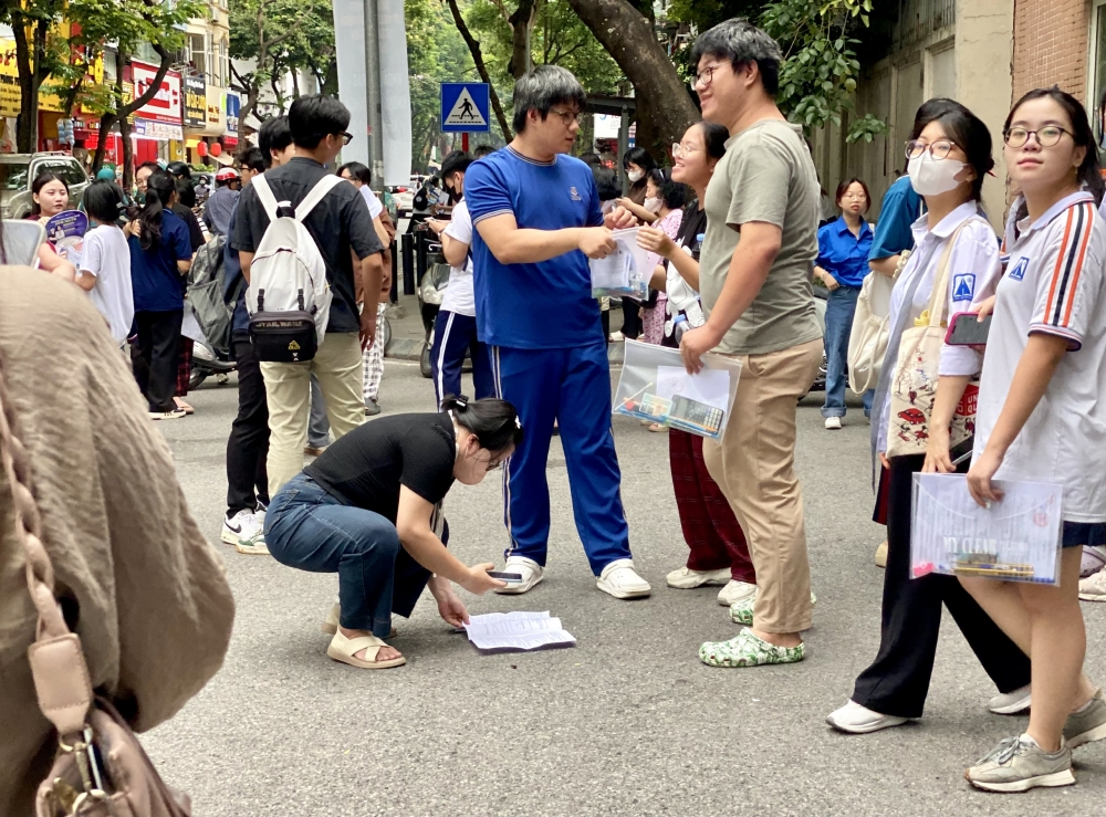 Ngay sau khi kết thúc giờ thi, một hình ảnh vô cùng xúc động đã diễn ra tại nhiều điểm thi - các thầy cô giáo không ngại ngồi ngay tại ghế đá, bậc thềm hay thậm chí là “dưới đất”, nhiệt tình phân tích đề thi và giải đáp thắc mắc cho học sinh. Từng nhóm học trò quây quần bên thầy cô. Có giáo viên còn nhanh chóng phác thảo đáp án lên giấy, chỉ rõ từng bước giải cho những câu hỏi khó.