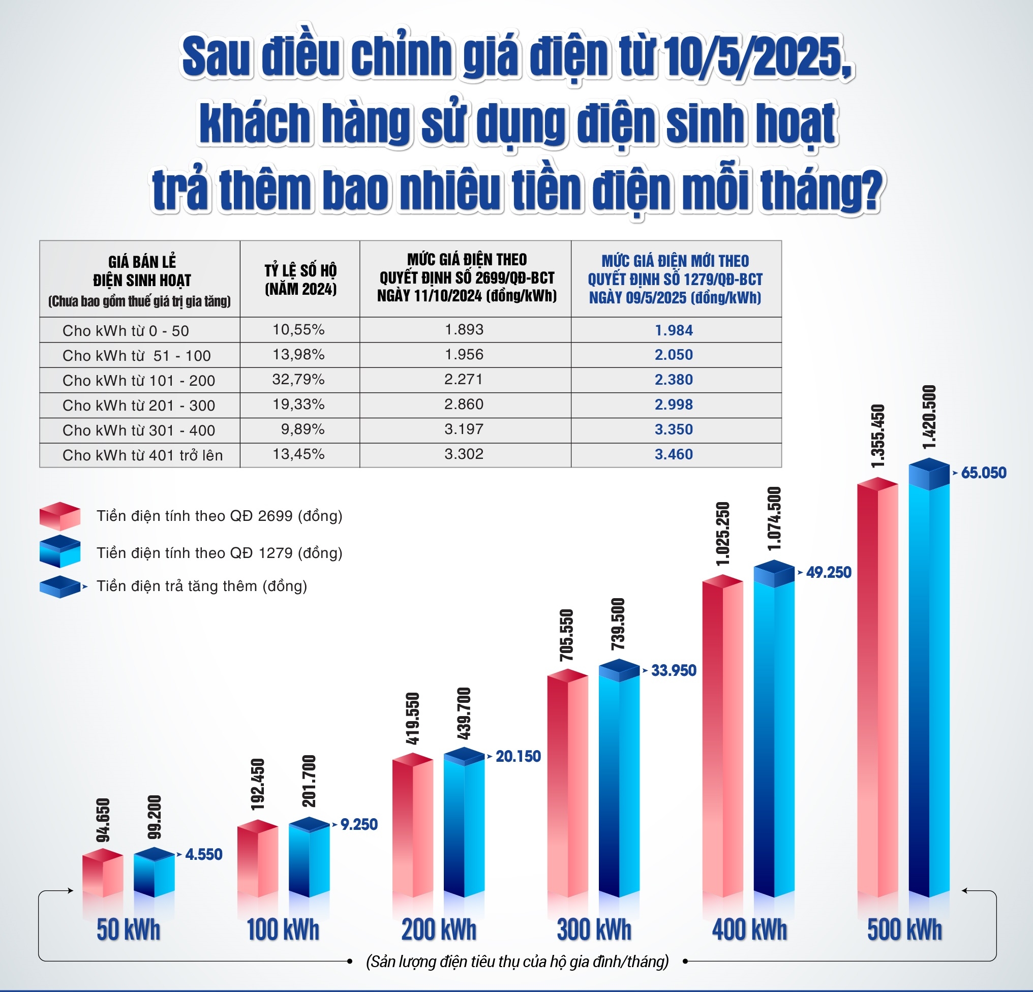 Từ ngày 10/5, mức giá bán lẻ điện bình quân sau khi điều chỉnh là 2.204,0655 đồng/kWh (chưa bao gồm thuế giá trị gia tăng).
