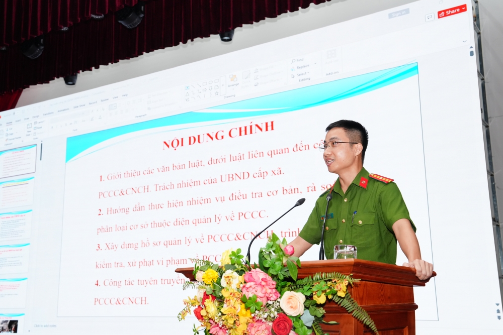 Tại hội nghị, Thiếu tá Phạm Văn Huy, Phó Đội trưởng Đội Chữa cháy và CNCH khu vực số 2 (Phòng PC07) đã trình bày các quy định pháp luật liên quan đến công tác quản lý nhà nước về PCCC&CNCH.