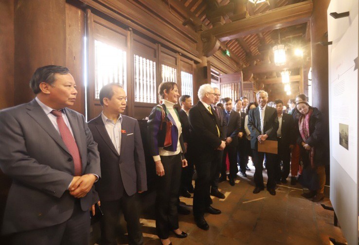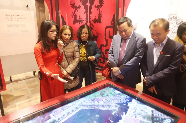 | PGS. TS Bùi Hoài Sơn, Ủy viên Thường trực Ủy ban Văn hóa, Giáo dục của Quốc hội và Phó Bí thư Thường trực Thành ủy Hà Nội Nguyễn Văn Phong cùng các đại biểu tham quan triển lãm “Văn Miếu trong sự hồi sinh di sản của Hà Nội giai đoạn 1898-1954” |