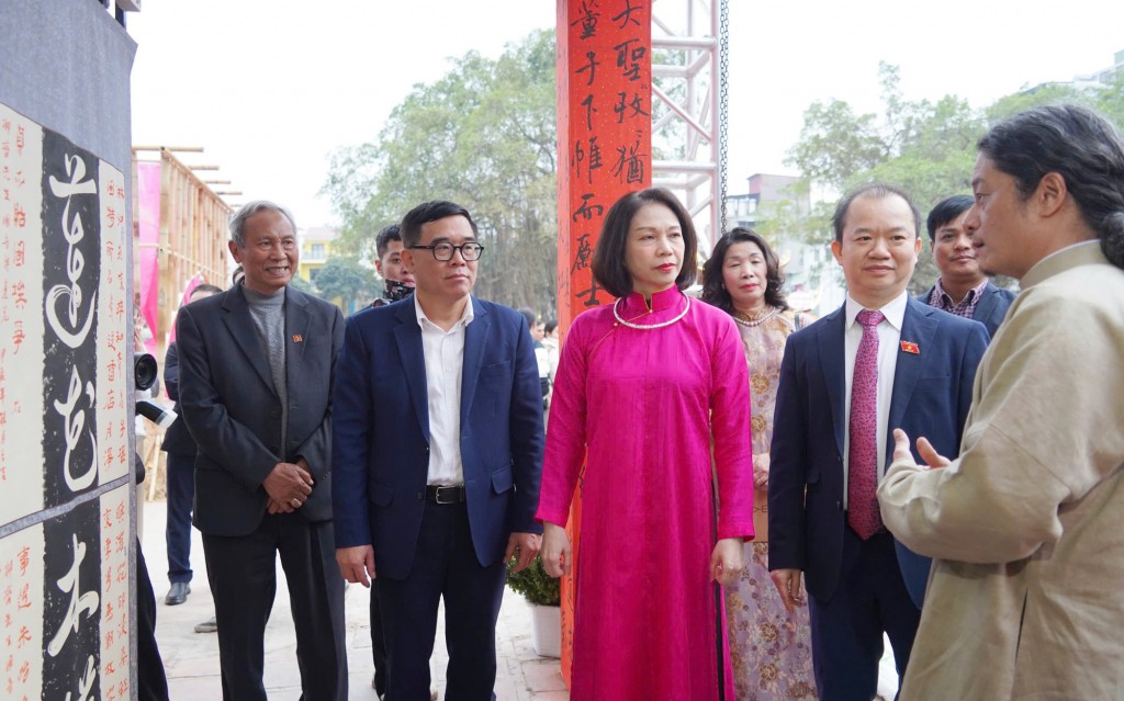 | PGS. TS Bùi Hoài Sơn, Ủy viên Thường trực Ủy ban Văn hóa, Giáo dục của Quốc hội cùng Phó Chủ tịch UBND TP Hà Nội Vũ Thu Hà, Giám đốc Sở Văn hóa và Thể thao Hà Nội Đỗ Đình Hồng tham quan tìm hiểu về nghệ thuật thư pháp Việt Nam ở Hội chữ Xuân Ất Tỵ 2025 tại Trung tâm Hoạt động Văn hóa khoa học Văn Miếu - Quốc Tử Giám |