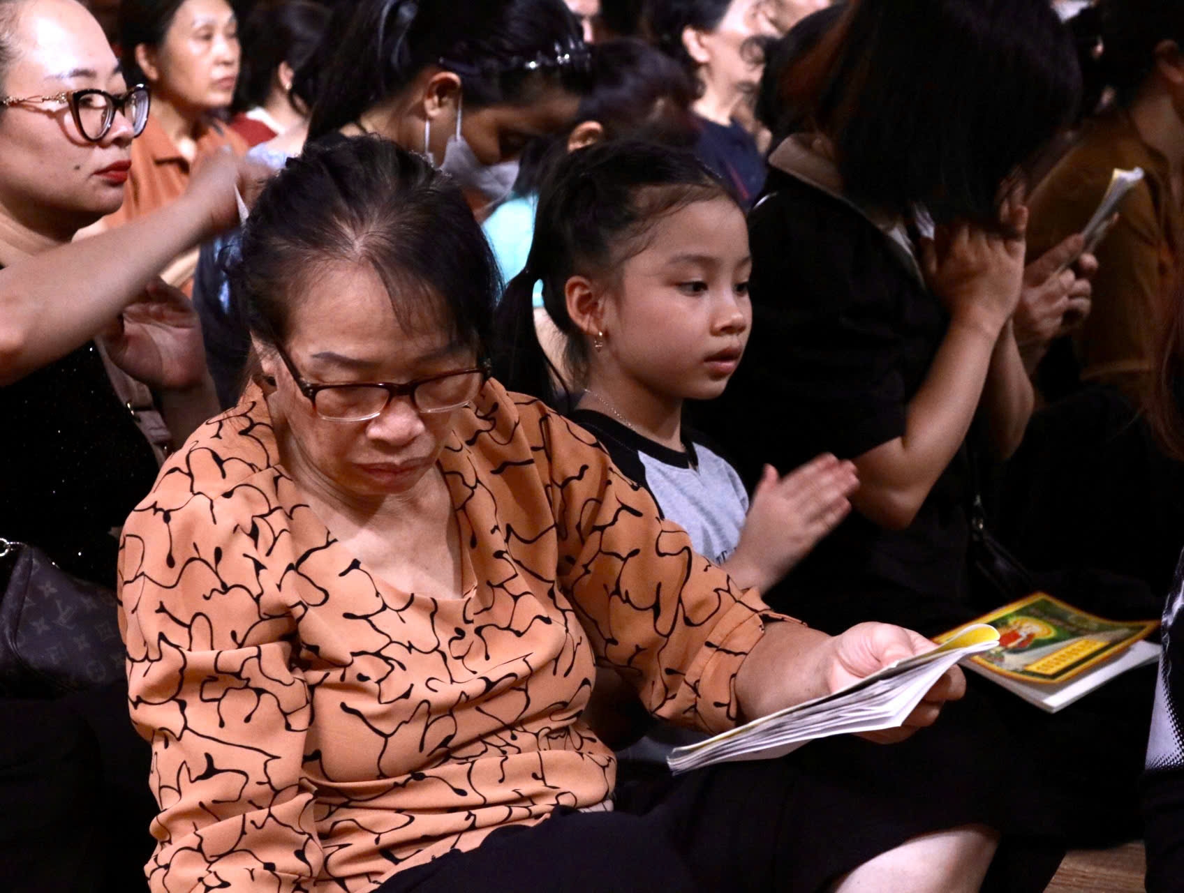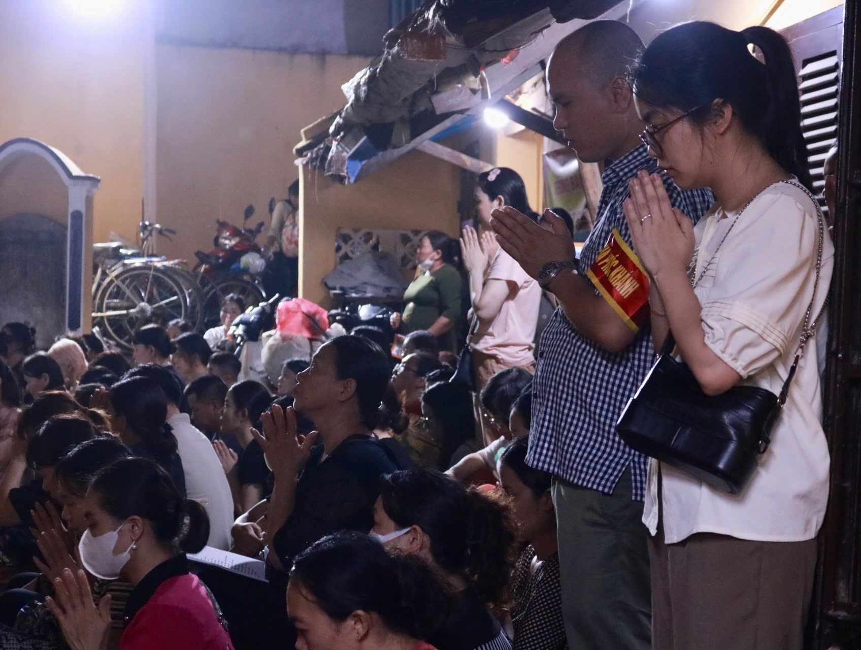 | Tất cả người dân đều kính cẩn chắp tay hành lễ theo tiếng tụng kinh gõ mõ của sư thầy. Không gian không còn một chỗ trống. |
