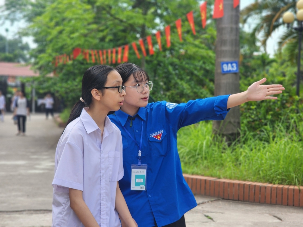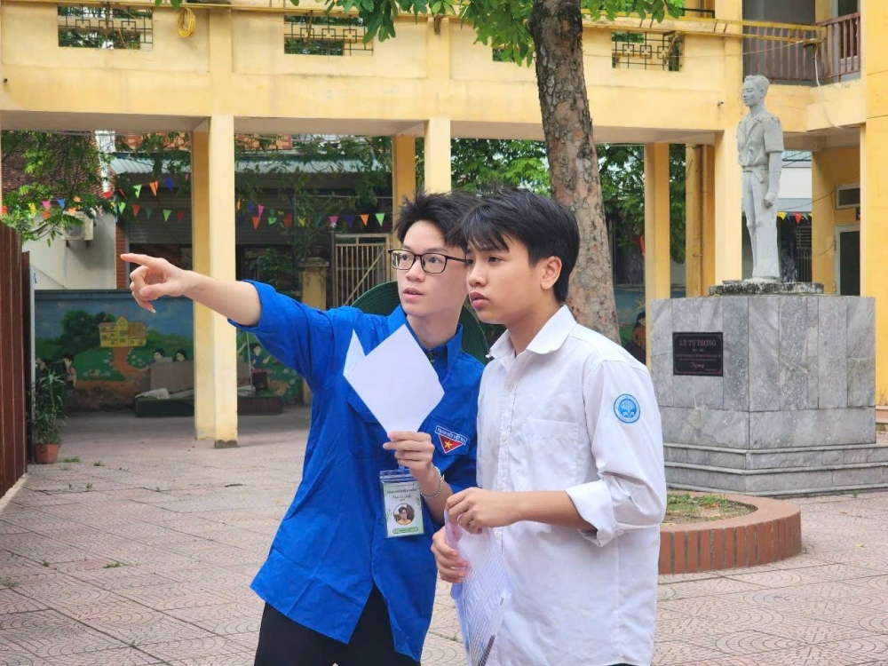 | Đoàn viên tình nguyện hướng dẫn thí sinh đến làm thủ tục dự thi. |