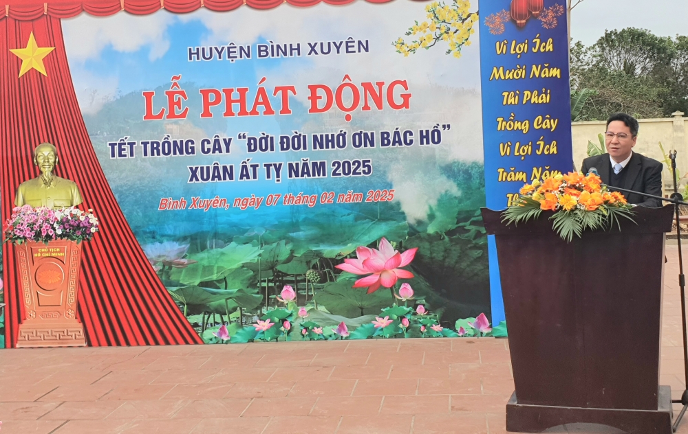 | Ông Nguyễn Hồng Phương, quyền Chủ tịch UBND huyện Bình Xuyên phát biểu lễ phát động Tết trồng cây |