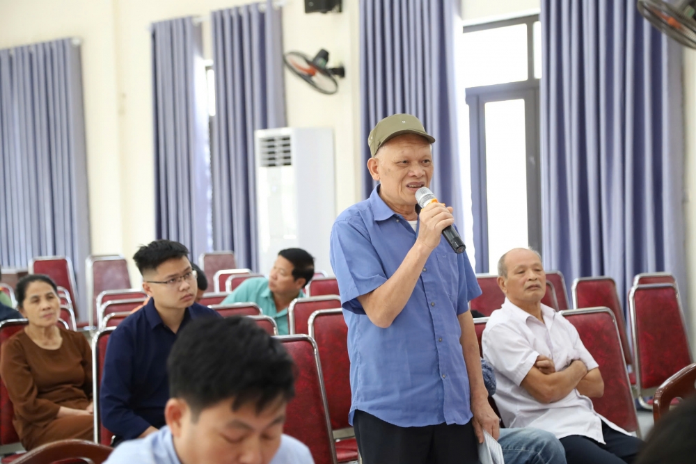 | Đại diện hộ dân đã xây dựng nhà ở và các công trình phụ trợ trên đất vườn, ao chưa đồng thuận phương án bồi thường, hỗ trợ giải phóng mặt bằng tại thôn Khê Ngoại 2, xã Văn Khê trình bày nguyện vọng với lãnh đạo huyện Mê Linh |