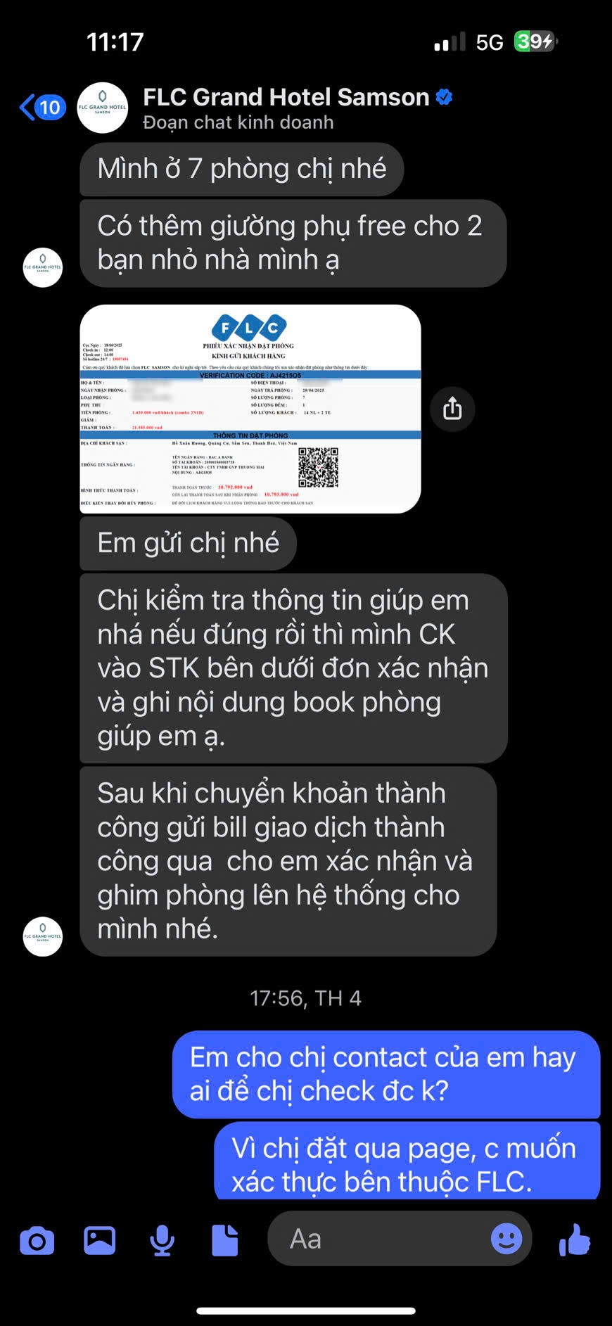 Chị Mai kể: “Tôi thấy fanpage có hơn 46 nghìn lượt theo dõi, lại có tích xanh nên rất tin tưởng. Tôi đặt 7 phòng cho gia đình đi nghỉ vào cuối tháng 6 này. Rất nhanh, phía bên kia phản hồi và xuất luôn voucher, với giá là gần 1,5 triệu/đêm. Nhưng khi chuẩn bị thanh toán 50% theo yêu cầu của họ, tôi ngờ ngợ vì tên tài khoản lại là một công ty khác không liên quan đến đơn vị FLC. Tôi đã nhờ bạn bè trong ngành du lịch kiểm tra lại thì phát hiện, đó là tài khoản của kẻ xấu. Rất may mắn là tôi đã cảnh giác”.