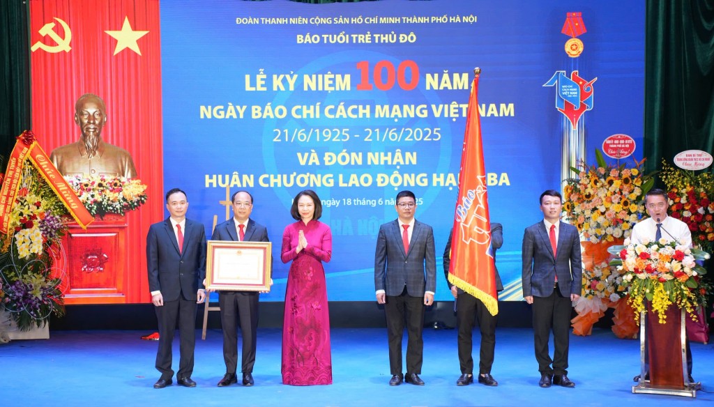 | Thừa ủy quyền của Chủ tịch nước, đồng chí Vũ Thu Hà, Thành ủy viên, Phó Chủ tịch UBND thành phố Hà Nội trao tặng Huân hương lao động Hạng Ba cho báo Tuổi trẻ Thủ đô |