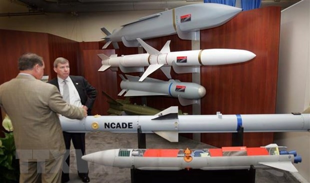 | Mô hình tên lửa của công ty Raytheon được trưng bày tại triển lãm hàng không và không gian ở Washington, DC, Mỹ. (Ảnh: AFP/TTXVN) |