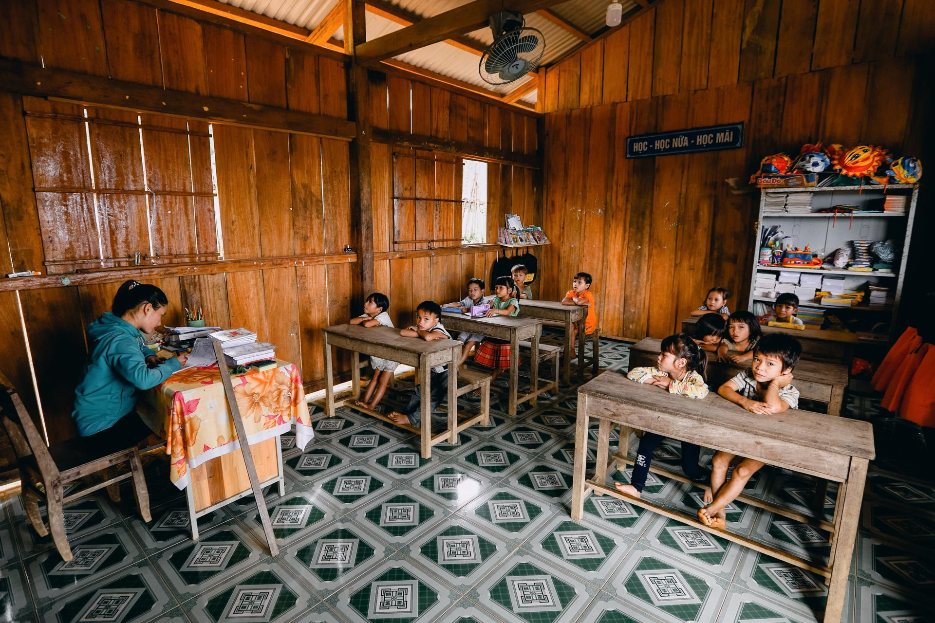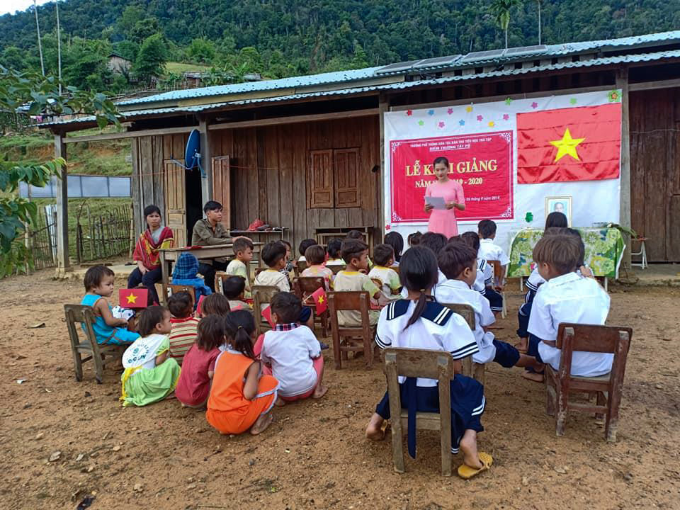 Có mặt tại trường những ngày sau lễ khai giảng, không khí học tập dần đi vào quỹ đạo sau tháng nghỉ hè. Lớp tiểu học gồm 6 bộ bàn ghế đơn sơ chia cho 2 độ tuổi, vài quyển sách, một chiếc quạt treo trên trần, một bóng đèn. Phía bên kia, tiếng ríu rít nói cười của những đứa trẻ mầm non. Một vài em còn phụng phịu với ba mẹ khiến cô giáo phải dỗ dành, chăm sóc.