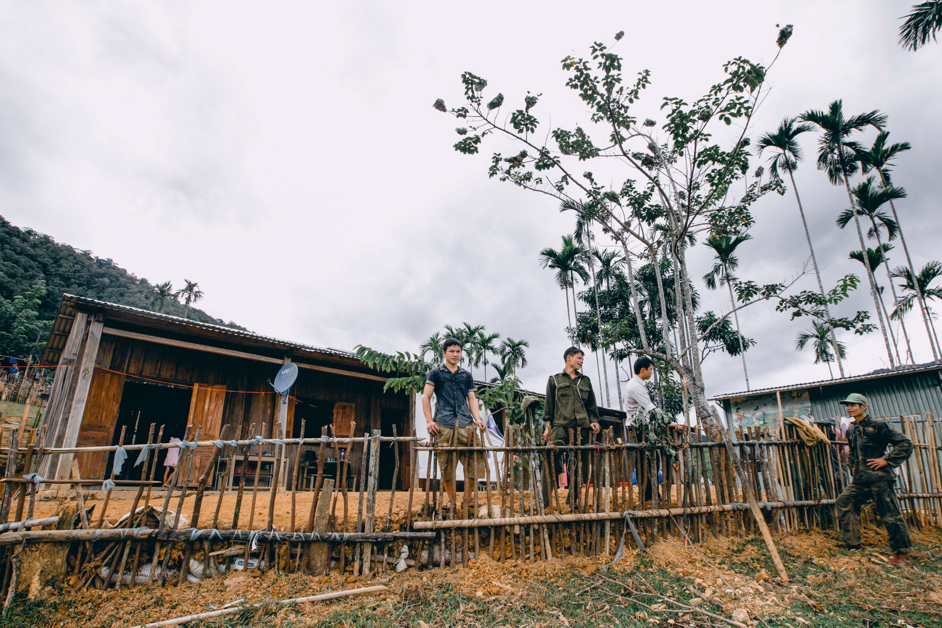 | Phụ huynh không chỉ đóng góp tre nứa, mà còn cùng nhau dựng lên hàng rào hoa cho cô và trò Tắk Pổ. |