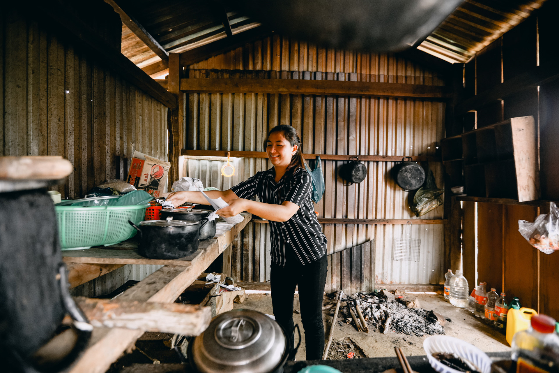 Hai cô giáo trẻ nhanh tay chuẩn bị bữa cơm trưa để cho kịp giờ lên lớp buổi chiều. Thực phẩm một phần được bà con biếu tặng, một phần mang từ những lần ra thị trấn. Nước uống lấy từ suối còn củi thì tự kiếm quanh rừng.