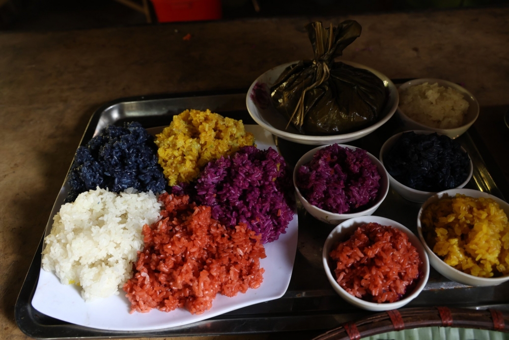 | Vào những ngày lễ hội lớn, đồng bào Mường thường đồ xôi ngũ sắc với năm màu xanh - đỏ - tím - vàng - trắng rất đẹp mắt. Xôi trắng tượng trưng cho tinh hoa của đất và rừng. |