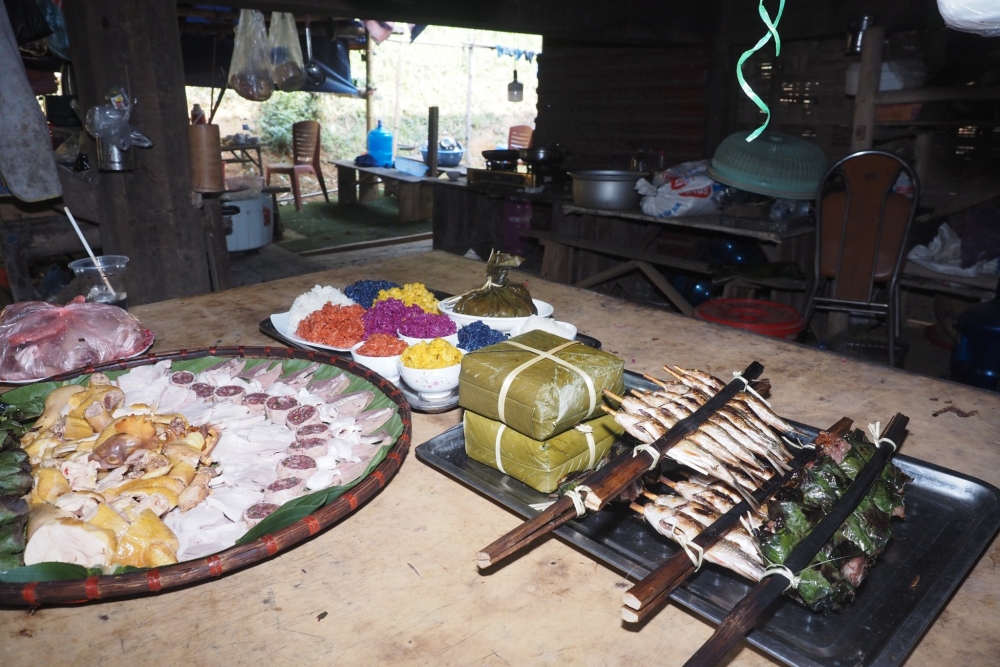 | Những món ăn được bày trên lá chuối, theo quan niệm của người Mường thì phần ngọn và mép lá tượng trưng cho Mường Sáng - của người sống, phần gốc lá và mang lá tượng trưng cho Mường Tối - Mường ma, của người chết. |
