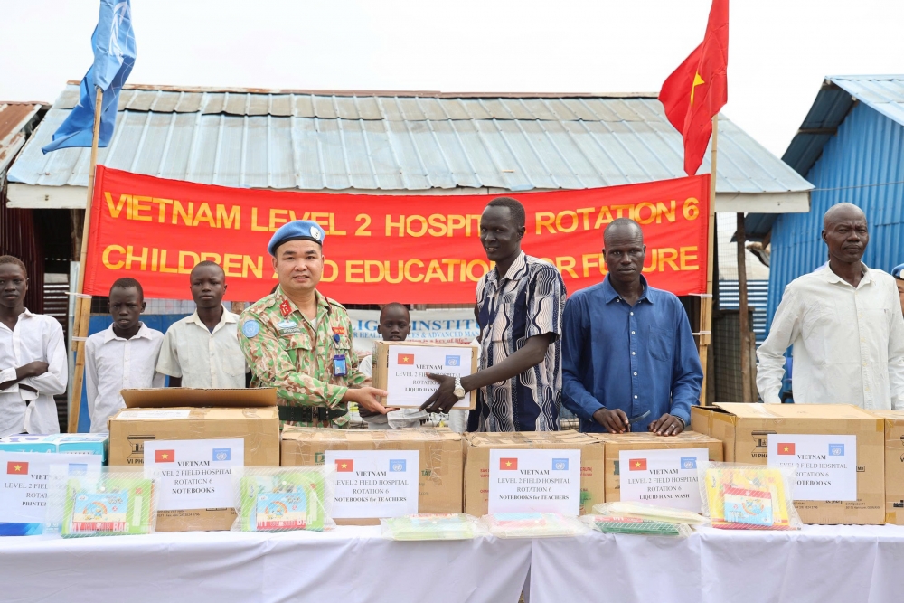Trước tình hình ấy, các cán bộ nhân viên Bệnh viện dã chiến cấp 2 số 6 đang làm nhiệm vụ tại đây đã có một hành động đầy ý nghĩa nhân Ngày Quốc tế thiếu nhi 1/6. Không chỉ hỗ trợ nhà trường những vật phẩm thiết yếu như bảng viết, bút, vở ghi chép, các cán bộ Việt Nam còn trao tặng 250 suất quà cho những học sinh tiêu biểu. Những món quà là nguồn động viên to lớn đối với trẻ em nơi đây.