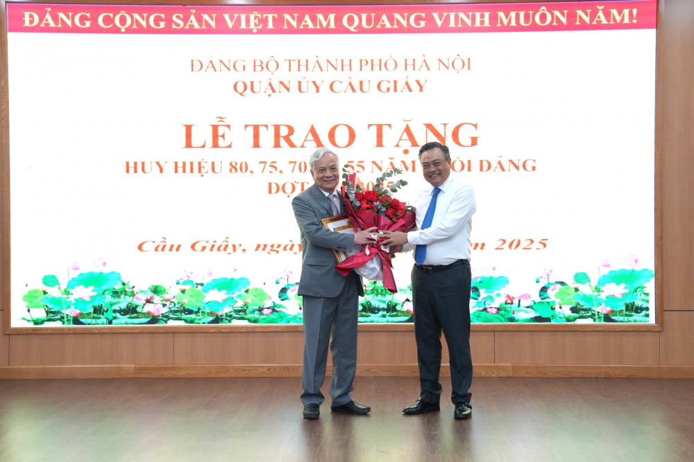 Tại buổi lễ, Chủ tịch UBND TP Hà Nội Trần Sỹ Thanh đã trao Huy hiệu Đảng cho các đảng viên được nhận Huy hiệu 80, 75, 70, 55 tuổi Đảng đang sinh hoạt tại Đảng bộ quận Cầu Giấy.
