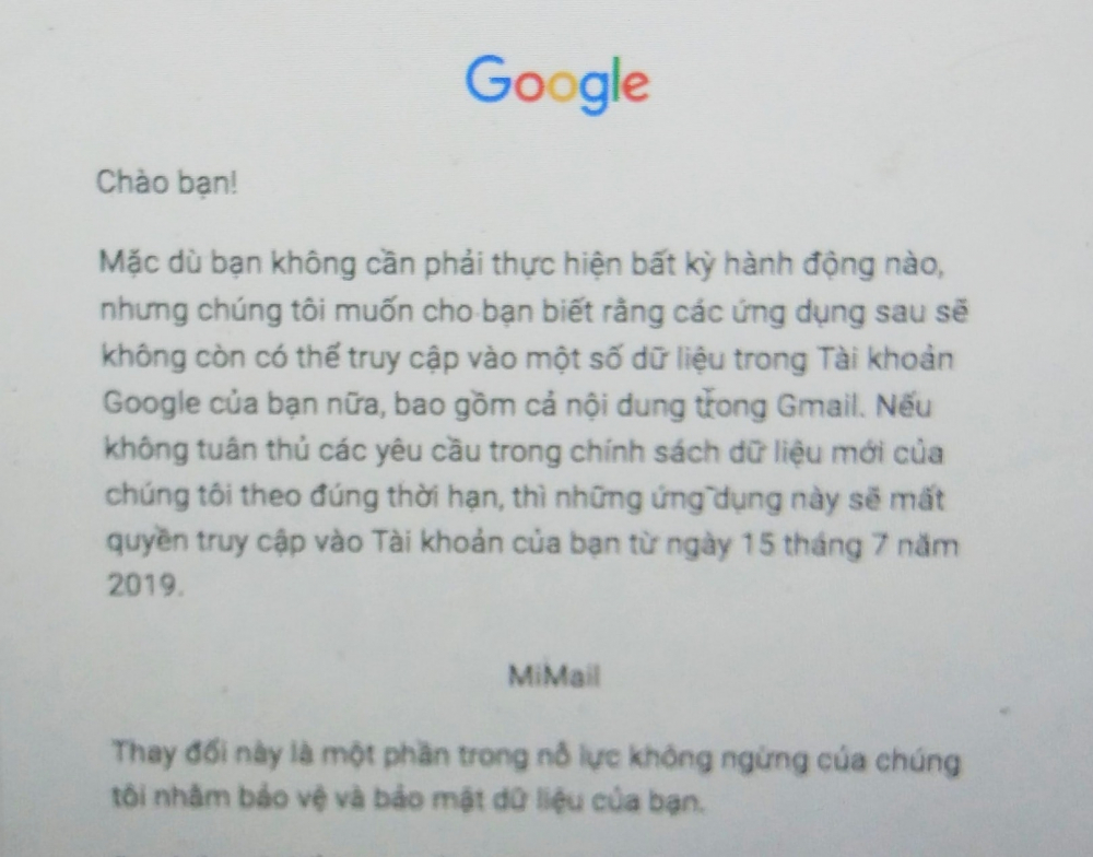 Cụ thể, thông báo từ Google nêu rõ: "Mặc dù bạn không cần phải thực hiện bất kỳ hành động nào nhưng chúng tôi (Google - PV) muốn cho bạn biết rằng các ứng dụng sau sẽ không còn có thể truy cập vào một số dữ liệu trong tài khoản Google của bạn nữa, bao gồm cả nội dung trong Gmail. Nếu không tuân thủ các yêu cầu trong chính sách dữ liệu mới của chúng tôi theo đúng thời hạn, thì ứng dụng này sẽ mất quyền truy cập tài khoản của bạn từ 15/7/2019".