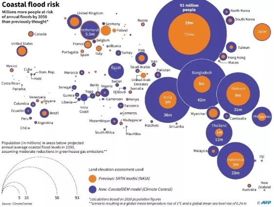 Dữ liệu độ cao được cải thiện cho thấy ngay cả khi giảm phát thải khí nhà kính vừa phải, sáu quốc gia châu Á (Trung Quốc, Bangladesh, Ấn Độ, Việt Nam, Indonesia và Thái Lan), nơi có tới 237 triệu người sống hiện nay, có thể phải đối mặt với các mối đe dọa lũ lụt hàng năm vào năm 2050, gấp hơn bốn lần so với các đánh giá dựa trên dữ liệu độ cao hiện hành là 54 triệu người.