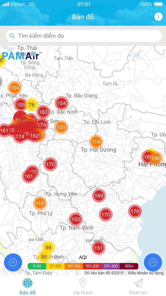 Đáng chú ý, một số điểm đo, có những thời điểm chất lượng không khí lên xấp xỉ ngưỡng xấu như điểm đo ở thành phố Nam Định vào 7h20 sáng qua, AQI lên tới 196, xấp xỉ ngưỡng xấu (AQI bằng 200). Với ngưỡng này, nhóm nhạy cảm như bệnh nhân hô hấp, tim mạch tránh ra ngoài, những người khác nên hạn chế ra ngoài. Sáng nay, điểm đo này ở ngưỡng AQI 153.
