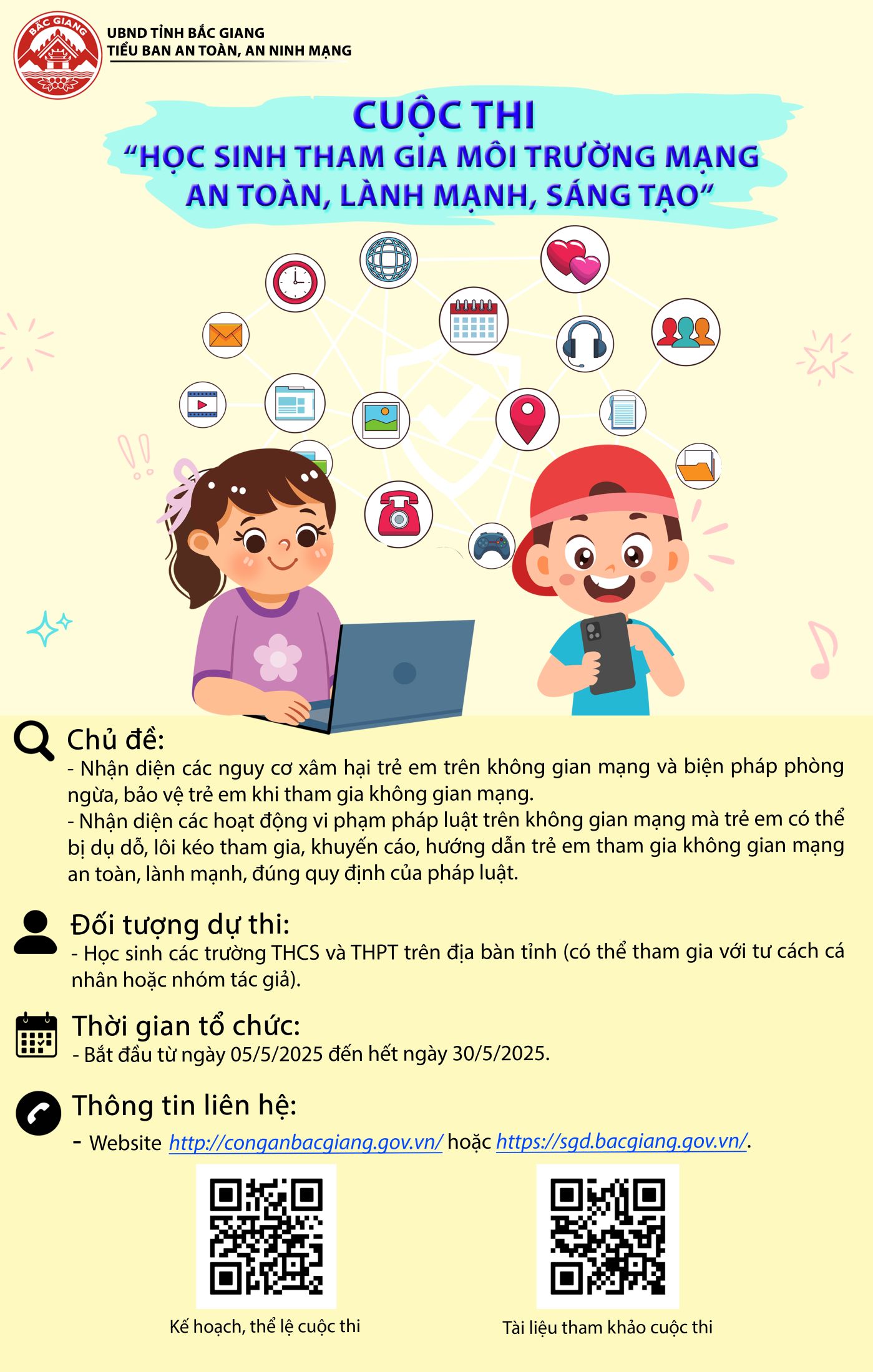 Thực hiện Kế hoạch số 68 ngày 28/4/2025 của Tiểu ban An toàn an ninh mạng tỉnh Bắc Giang, nhằm tăng cường công tác giáo dục kiến thức pháp luật, kỹ năng cho thanh thiếu niên, nhi đồng nói chung khi tham gia môi trường mạng; phát huy tính chủ động, sáng tạo của các em học sinh khi tham gia vào các hoạt động của nhà trường, xã hội. Đồng thời huy động sự vào cuộc của gia đình, nhà trường và toàn xã hội trong việc định hướng, bảo vệ và giúp đỡ trẻ em khi tham gia các hoạt động trên không gian mạng. Tiểu ban An toàn, an ninh mạng tỉnh Bắc Giang chính thức phát động cuộc thi 'Học sinh tham gia môi trường mạng an toàn, lành mạnh, sáng tạo' trên địa bàn tỉnh và chỉ đạo tổ chức điểm tại Trường THPT chuyên Bắc Giang.